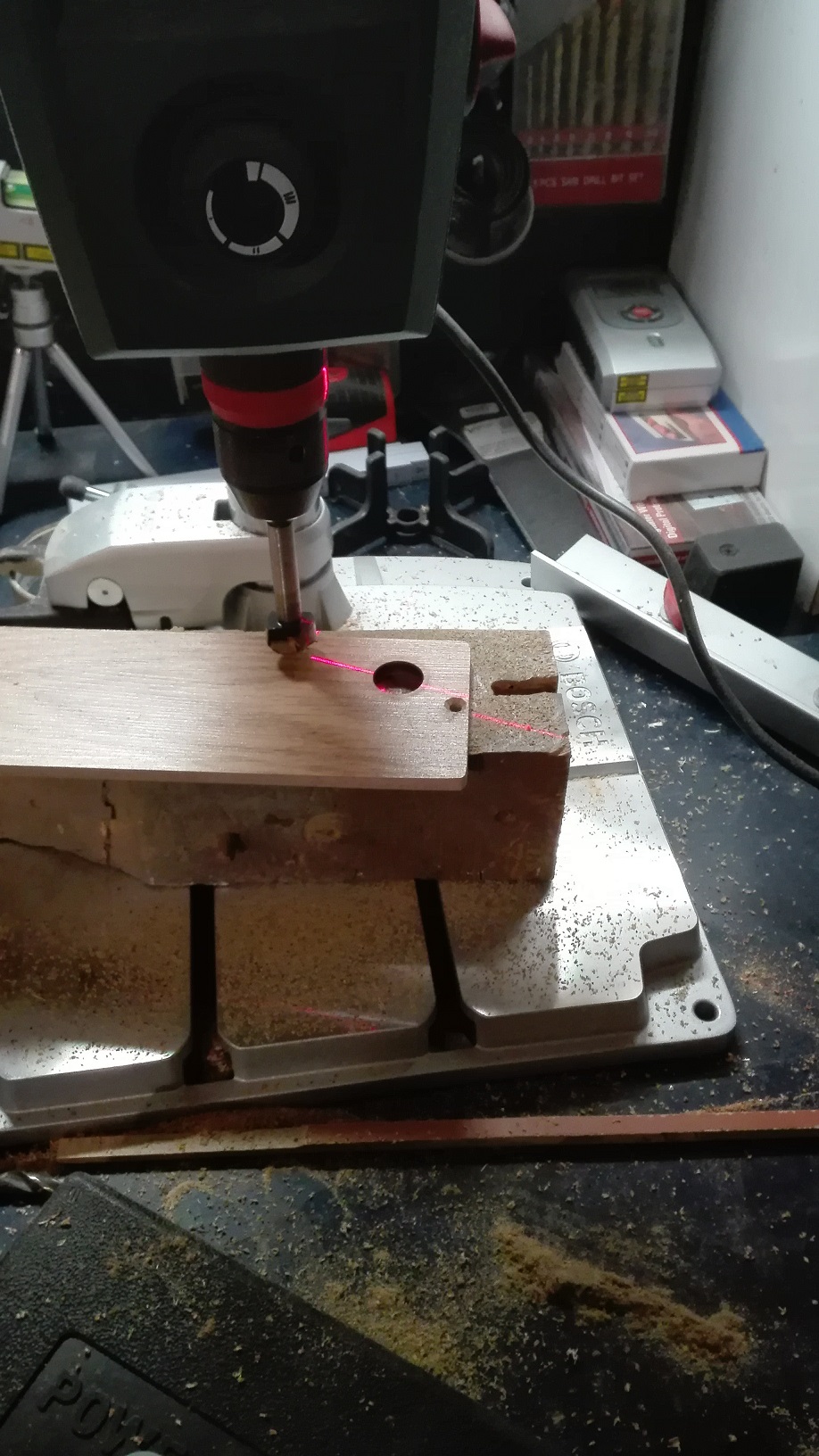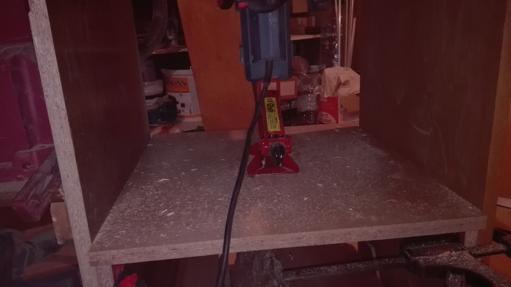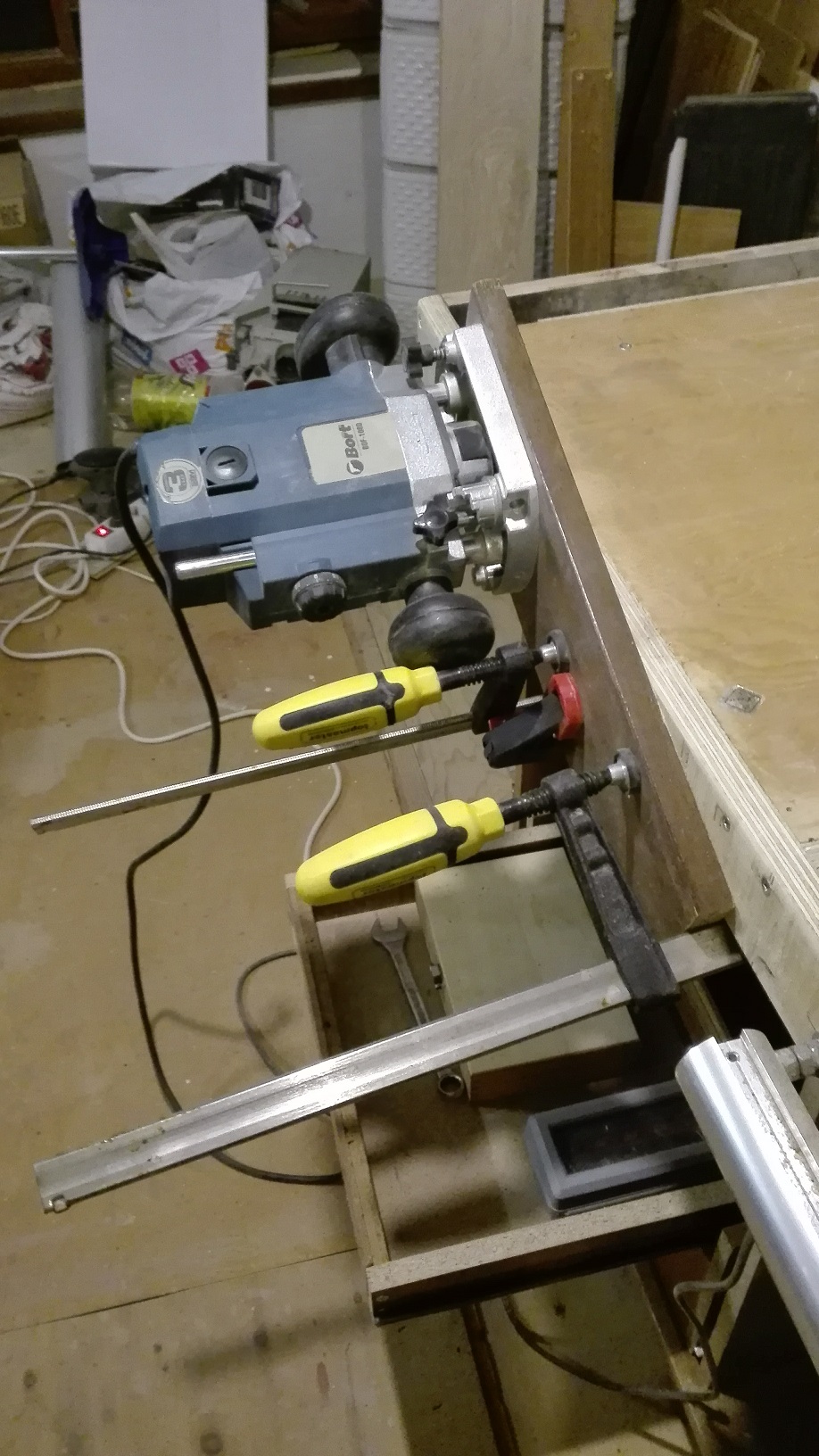 Днес направих Фърчащ монтаж на фрезата за проба и тръкнах леко едно первазче........машинката работи перфектно. Отдолу я подпрях с едно крикче (пантограф)...... и за първо време мисля, че е много добре. Сравнително леко се движи, но все пак ще му закрепя една манивелка за по-удобно. Следващата стапка ще бъде да спретна един гъзарски линеал (кух с прахоотвеждане от отсрещтната страна), но не знам кога, защото ми изгоря работната прахосмукачка (Parkside - след 6 години вярна служба) а бюджета ми отиде за бормашинка.