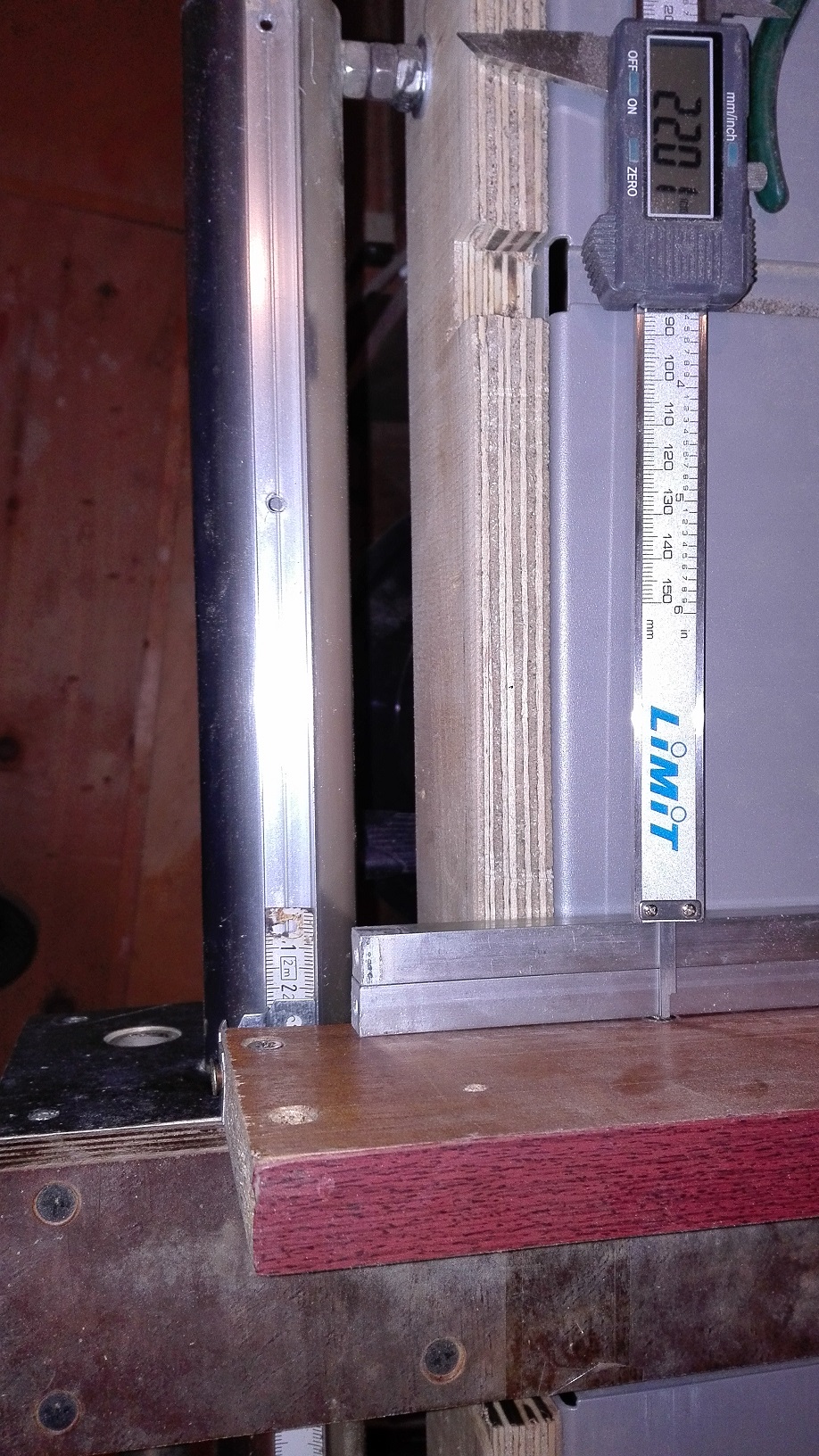 ......нагледен пример как трябва да ни направите приспособление, с което да си направите второ приспособление, за да си направите трето приспособление. По почина на един много тертиплийски испанец захванах оберфрезата хоризонтално и си изтъних безлуфтовата вложка за циркуляра с помощта на, която си нарязах профилни релсички за бърз демонтаж на фрезата.
