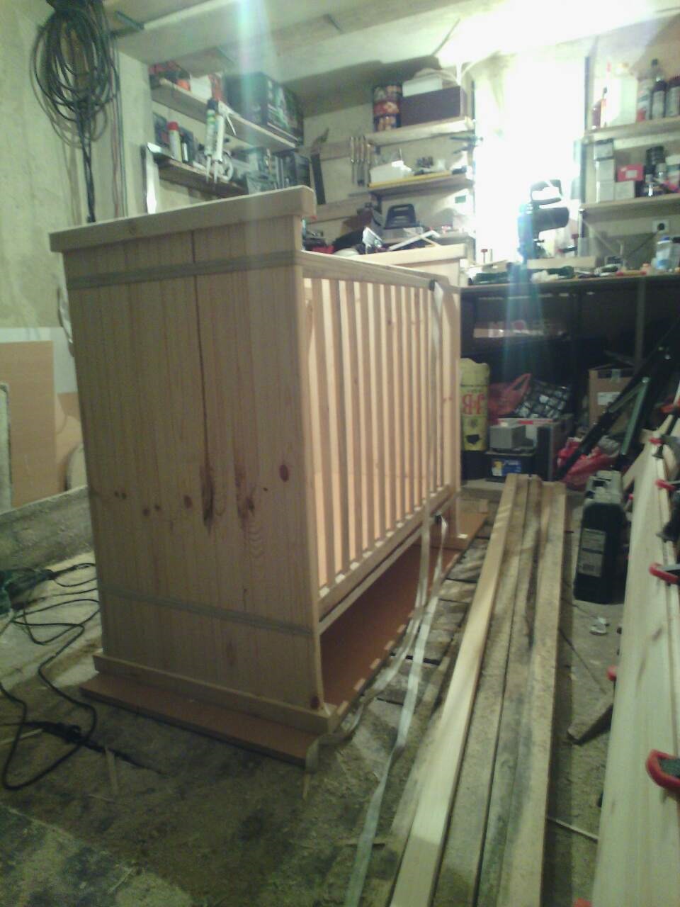 Нямам абрихт, щрайхмус и страниците ги сглобих от дюшеме уж право ама пак се получи малко усукване. Отделно вечерта на снимката жената като тества как ще се навежда да слага и взима детето я е бутнала без да забележа а тези колани няма да я спасят. И сега седи малко килната :( Като цяло не съм доволен от първото си такова изпълнение.