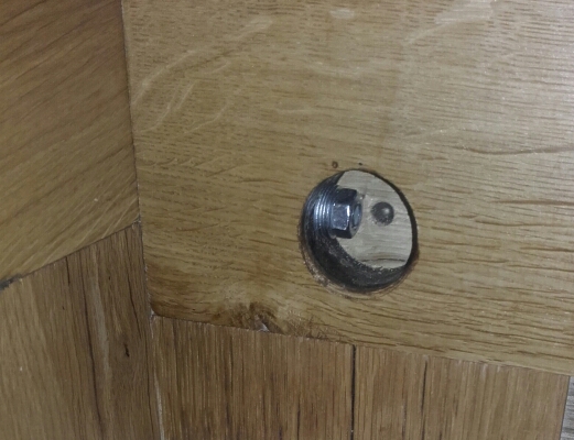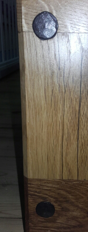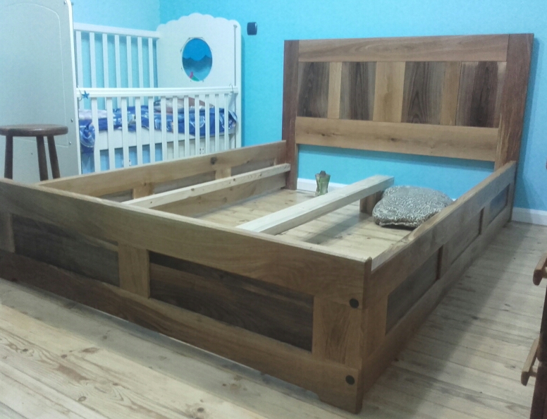 Леглото е готово.Дъбови рамки с орехови табли и домашна вакса.Сглобките са с по 3 дибли и два болта.Отзад с обикновенни болтове с втулка с резба навита в страницата.Отпред с коларски болтове и скрита гайка.Изковах малко главите на лъскавите коларски болтове така мисля че по-подхожда на дъбът.Мога само да кажа че стана адски стабилно.