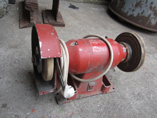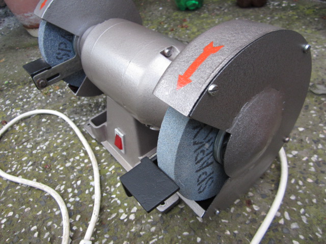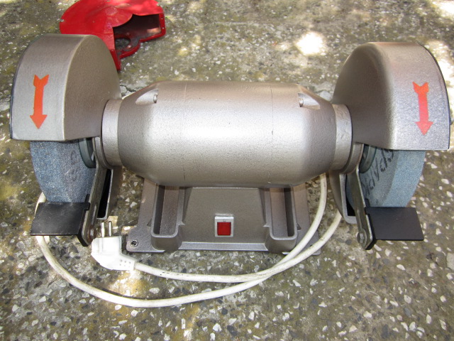 ...преди време се сдобих с един шмиргел...машинката е българска-ШД 500/175, производство на завод Елпром-Тетевен...като за домашно ползване е с много добри параметри-мощност 500вт. и 'фи' на камъните 175мм...по външният вид имаше козметични забележки...при работа-повишен шум в лагерите...липси- изцяло липсваше левият кожух(предпазител) на камъка,а на десния липсваше външната предпазна ламарина...липсваха и двете опорни пети...предвид това,че камъни от оригиналния размер175/25/32 се намират трудно,реших да мина на 150мм като за целта и колегата ZEDYСUS ме улесни максимално подарявайки ми готов оригинален предпазител който да замени липсващия...в последствие обаче със съдействието на Kumay се снабдих с камъни от оригиналния размер и възникна необходимостта от изработката на изцяло нов предпазител...след съответното рязане,пилене,заваряне,боядисване и т.н. като краен резултат се получи следното:
