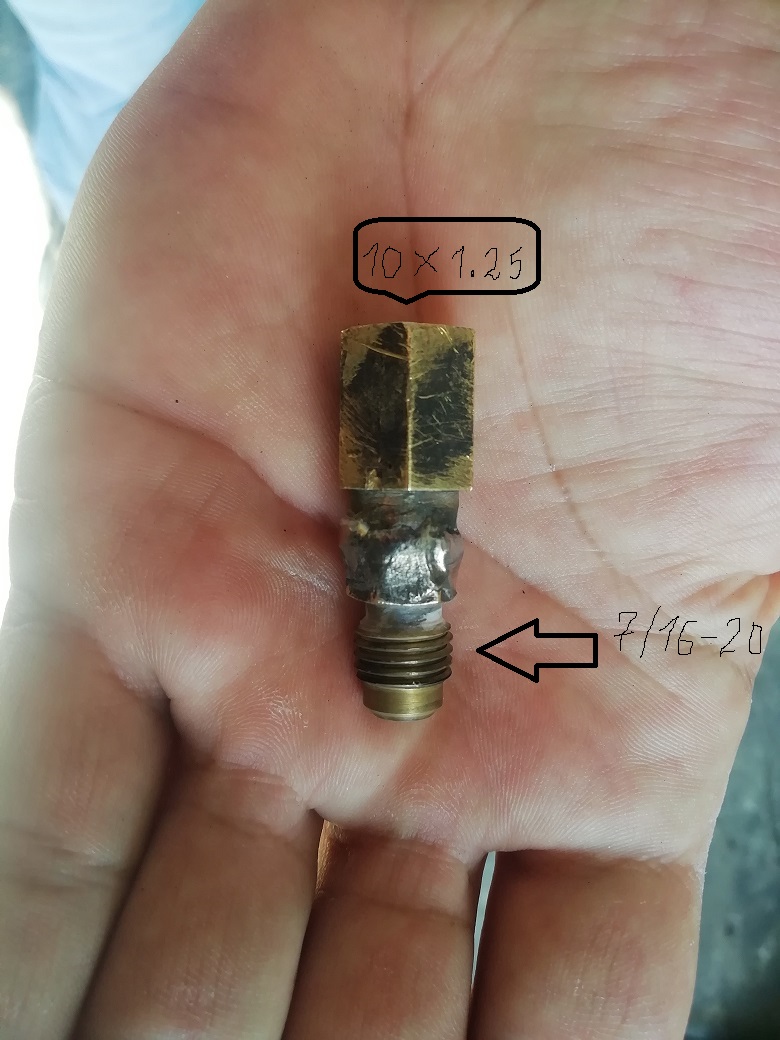 От стария датчик използвах корпуса и към него ми завариха накрайник 7/16-20 (накрайника комплект с игличка и капачка 1.20 лв.).