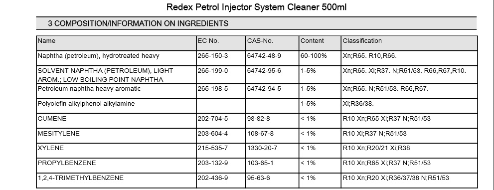 И тъй като става дума основно за дизела от съдържанието се вижда че в тая добавка няма нищо друго освен керосин тежка фракция, нафталин под 1% и от 1% до 5% 2-етилхексил нитрат който е детергент или по народно му - миещо вещество.