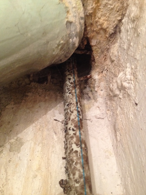 В момента е сухо. Скоро не е текло - не помня кога за последно. Всички тръби вече са PVC. Капе на едри, тежки капки, които се чуват да падат като дъжд по цялата повърхност, и където е легена върху казанчето, но и отзад, съвсем към стената, където не може да обхване, и следователно по цялата стена и до пода. Сега напръсках със "Саво" (препарата против мухъл), макар че мухъл не виждам, с изключение на черните петна по най-дясната тръба (на първата снимка тук).