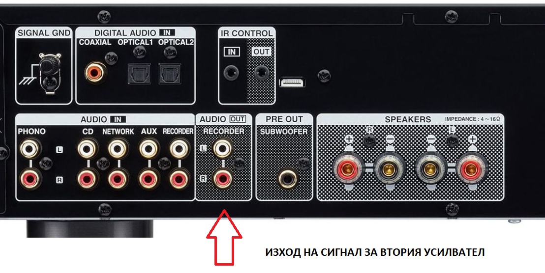 - От AUDIO OUT на първия усилвател САМО с един стерео кабел подаваш сигнал към вход AUX на втория усилвател.