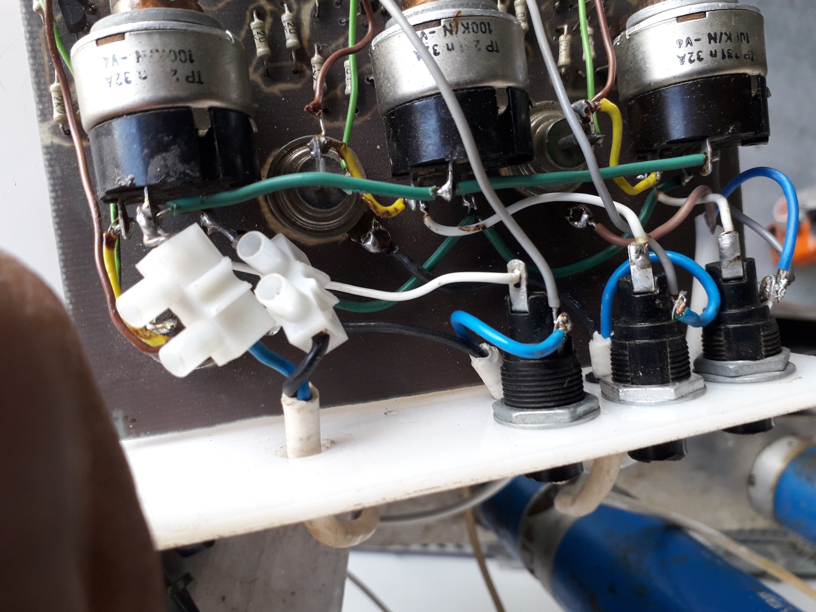 потенциометъра има 4 извода и захранването е на два от тях , на третия извод е тиристора а на четвъртия през бушон към двигателя.всеки потенциометър в крайно ляво положение има ключ за прекъсване на веригата.