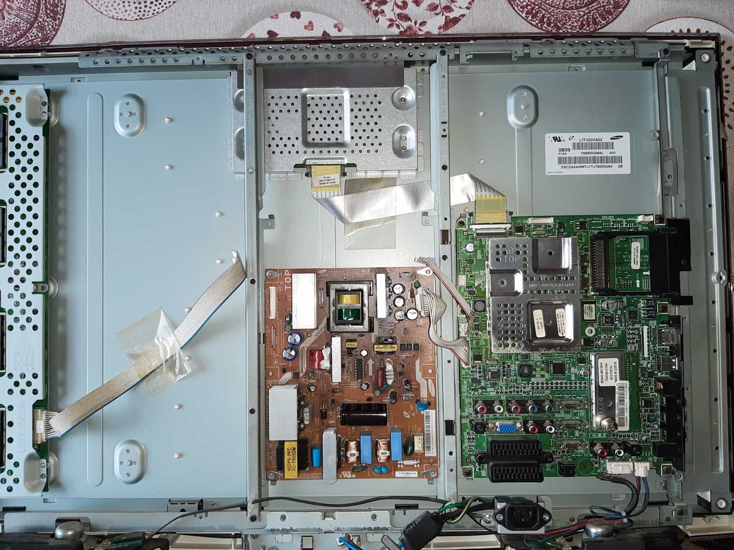Най-сетне го отворих и минах с прахосмуча. На централната платка със захранването се видат 3 бременни кондензера.