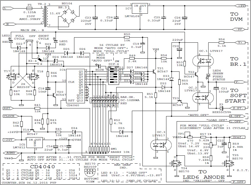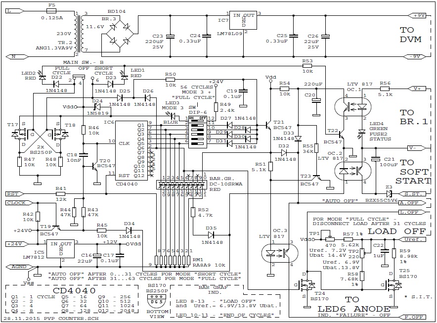 Диодът D22 от старата схема е излишен, тъй като обратното напрежение на прехода "е-в" на Т15 е под максимално допустимото - 5V (в случая - 4.97V), при което епитаксиалната база не може да пробие ценерово. Това напрежение се определя от делителя R38; R39, плюс пада върху светодиода LED6, като максималната му стойност е само в нулите на напрежението, а през останалото време на полупериода е по-ниско, което се вижда от осцилограмата: