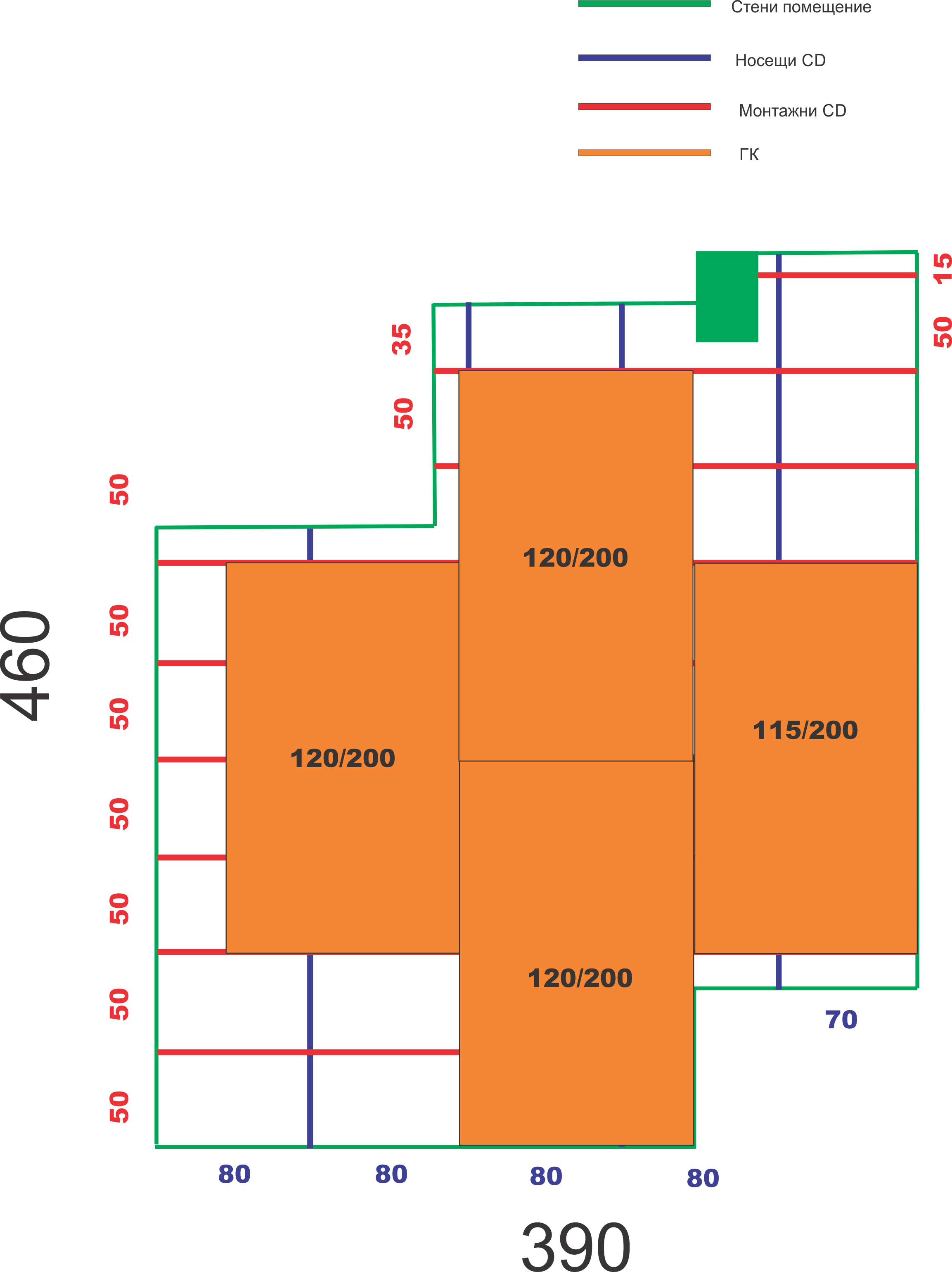 Нещо такова: Проблема е, че по стената, точно където трябва да сложа УД профила (вдясно на картинката) минават много кабели.