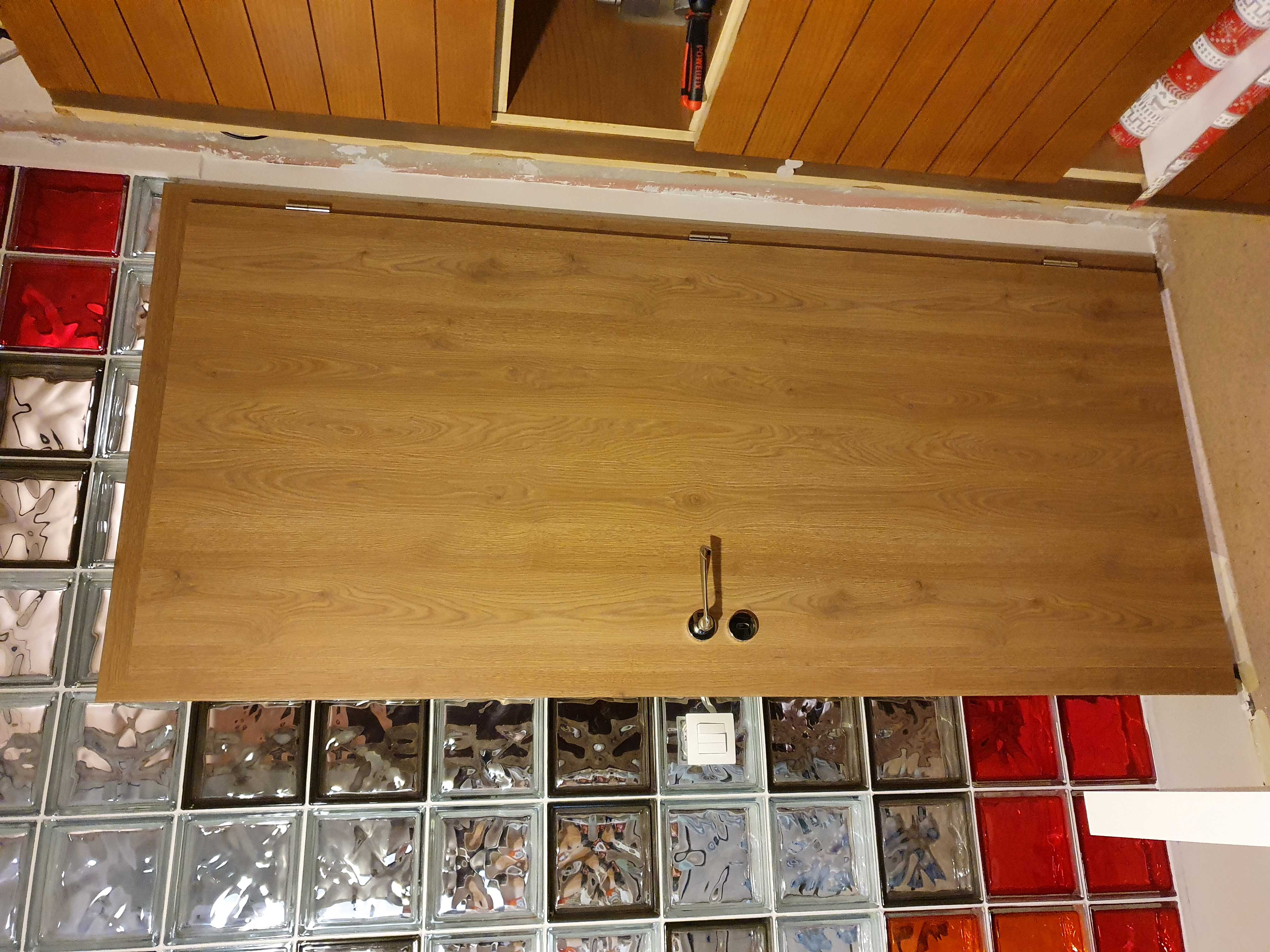 Слагам 1-2 дни почивка (хем да почистя малко) и ще се захващам.. После трябва и вратата да сложа :) Наложих касата и зъба съм го направил адски точно в 1 равнина със стената :supz: :supz: Да не кажа голяма дума ,но грам фуга няма, като легне касата :) Самия зъб от ~10см го направих от 5 слоя картон + плътно лепило :) + външно обличане с картон.