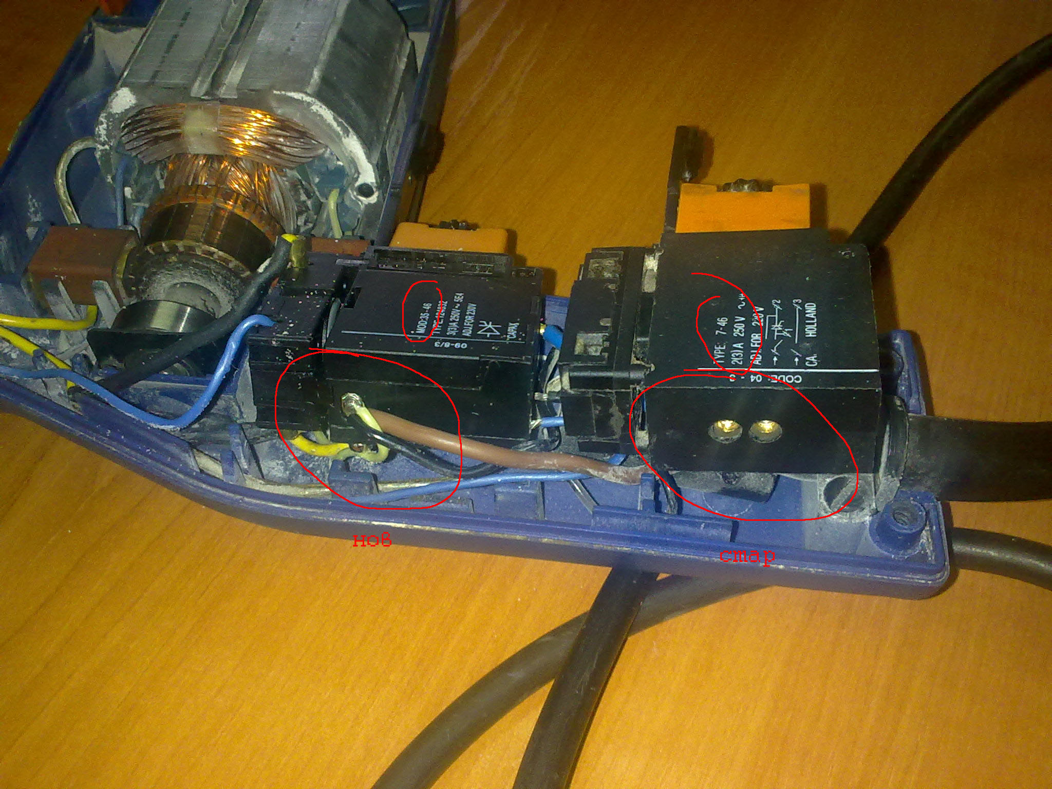 От години ползвам въпросната машинка и ми е служила вярно. От извесно време ми се счупи лостчето на реверса на бутона. Реших да я обновя с нов бутон, разглобих я и си записах точно разположението на кабелите и буксите на стария бутон но се оказа че новите имат разлики в буксите. След като монтирах новия спазвайки местоположението на кабелите от стария бутон не иска да тръгва :? Та въпроса ми е има ли разлика в схемите между двата бутона? Забелязах че освен буксите има разлика и в типа на бутоните. Някой ще може ли да ми помагне със схема на връзване на новия бутон. Освен бутона съм сменил и четките с нови.