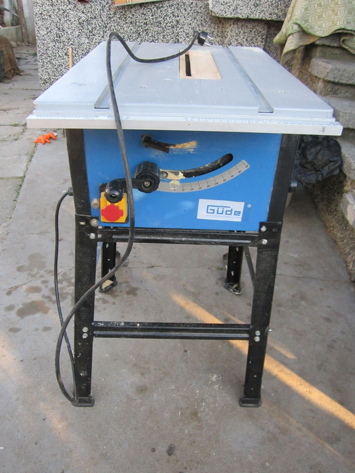 Ето го злополучния циркуляр :-D Не съм сложил плотовете отстрани защото са много малки и са направени от гадна ламарина и се огъва при натиск както и на самата машина.Сложил съм дървен капак около диска защото пластмасовия даде фира след обратен удар след рязате на цепеник :lol: и на стария диск бяхя изпочупени зъбите