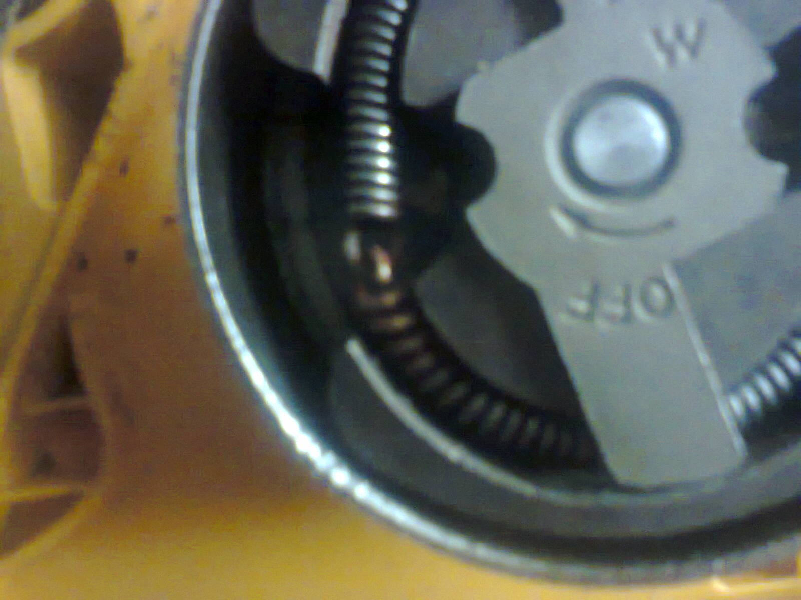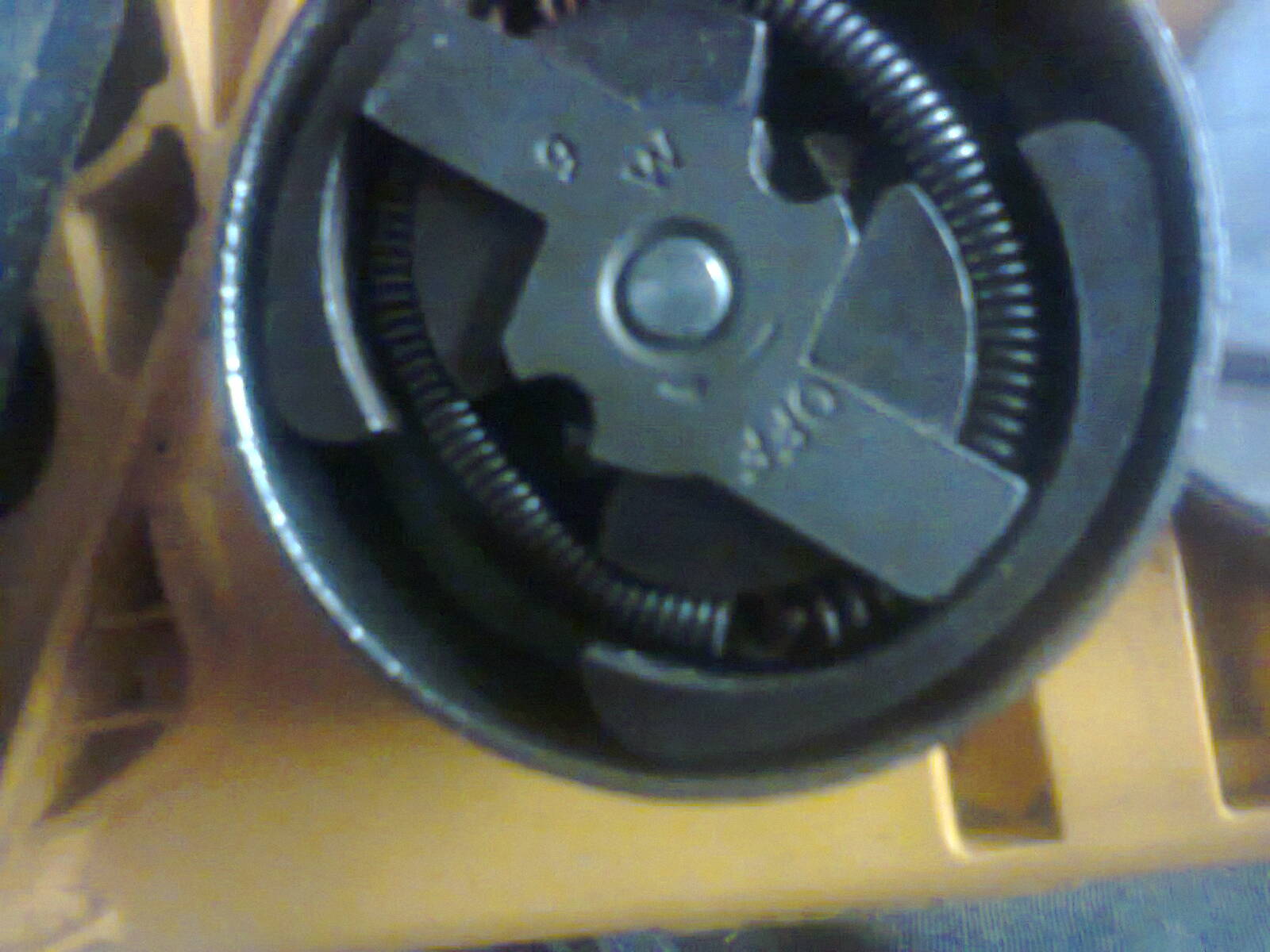 Ето как става при бойни условия.Съжалявам за лошите снимки при тази светлина,но се вижда промяната в положението на пружината спрямо тежестите и краищата и.Пружината се приплъзва внимателно с клещите в леглото си,докато закопчаването дойде в празно място между тежестите.С клещи и отвертка се поотварят ушите и и с два чифта клещи или(според наличността на инструменти) с едни клещи и отвертка между навивките на отсрещния и край,ушите се откопчават едно от друго.Измъква се старата пружина и новата(или ремонтирана) се вкарва разкопчана на нейно място и след това се закопчава по същия метод.Това е оправдано при полеви условия,липса на специализиран инструмент или въобще зорно положение.Правилната технология е с разглобяване,естествено.
