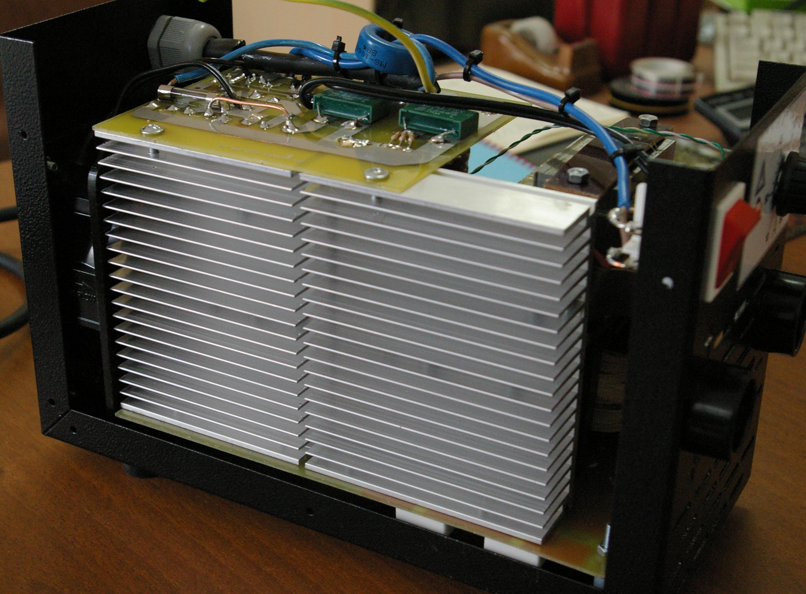 Тонкость в том, что транзисторы очень сильно греются и их необходимо установить на мощные алюминиевые радиаторы. Чем больше радиатор, тем больше съем тепла с него, а следовательно его охлаждающая способность. На деле схемотехника MOSFET не позволяет создать аппарат на одной плате: те аппараты, которые сейчас есть в продаже собраны в основном на трех платах (IGBT аппараты всегда идут на одной плате). Соединение трех плат, худший теплообмен, каскадный выход транзисторов из строя при неисправности одного транзистора, меньший КПД (относительно IGBT) –вот основные недостатки MOSFET по отношению к аппаратам IGBT. Проще говоря, IGBT более современная технология, чем MOSFET. Хотя сразу оговоримся, что недостатки эти ничтожны, по сравнению с достоинствами сварочного инвертора, скажем, по сравнению со сварочными трансформаторами. Необходимо также отметить, что мощные индустриальные инверторы пока собираются по MOSFET технологии.
