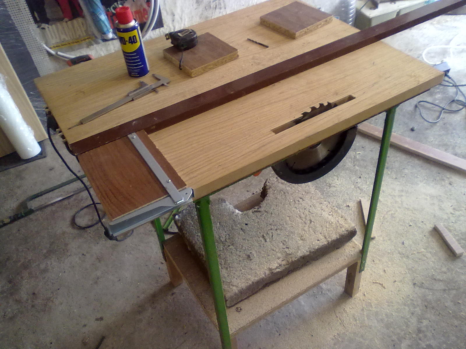 Последен "тунинг" : окастрих го малко, за да влиза под работната маса и да не го прескачам. Закачих един разклонител с ключ и вече мога да го пускам и да го гася от него. Оказа се, че в този си вид циркулярчето ми свърши страхотна работа и горещо препоръчвам на всички нуждаещи се да си сътворят нещо подобно. Живот и здраве имам намерение да си вградя и оберфрезата, но май докато не ми се наложи да фрезовам, ще си остане така.