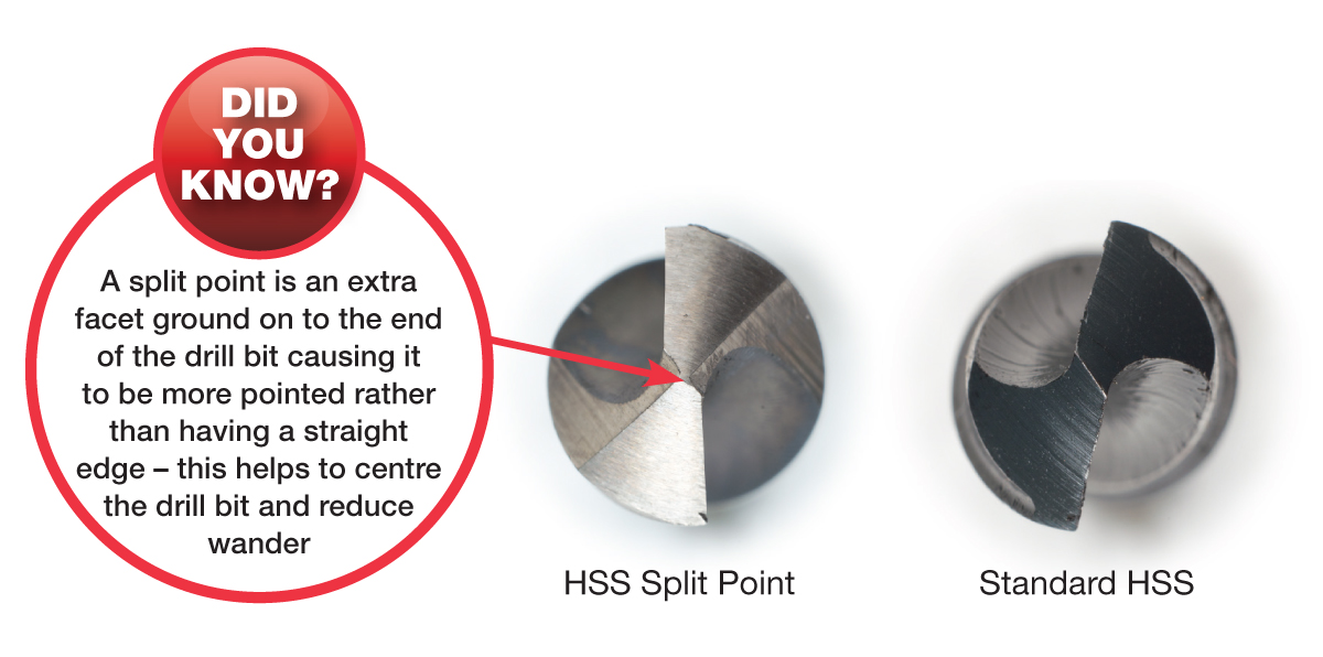 135° split points should be engaged to cut harder steel materials and especially in deep holes over 4 times drill diameter. A 135° point cutting harder materials will produce thicker chips, thus minimizing work hardening of the cavity. The length of the lips on a 135° point measured from the axis to the outer corners is relativity short and thus penetrates much quicker into the work piece reducing thrust and abrasion along the cutting edges."