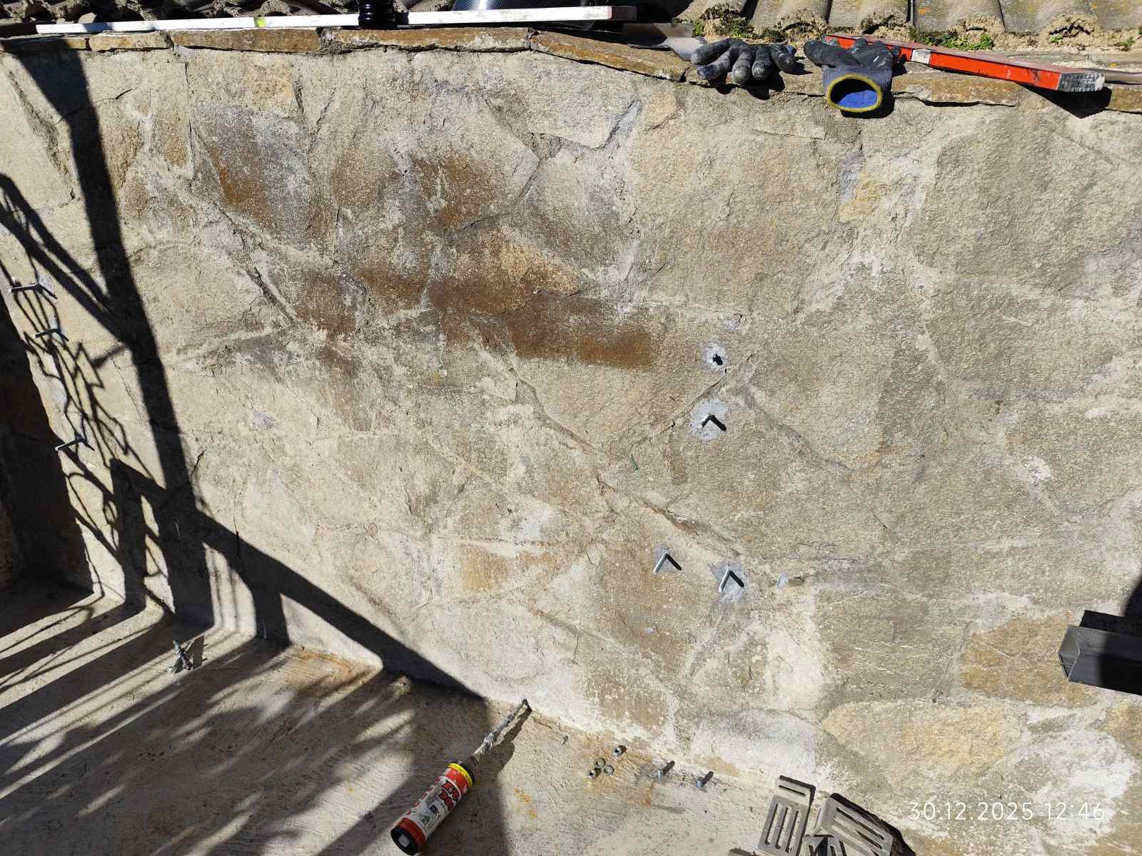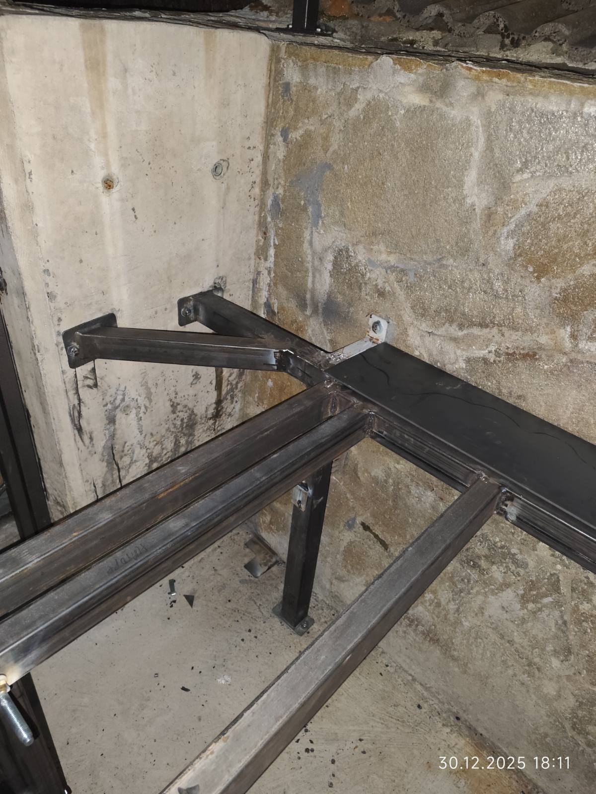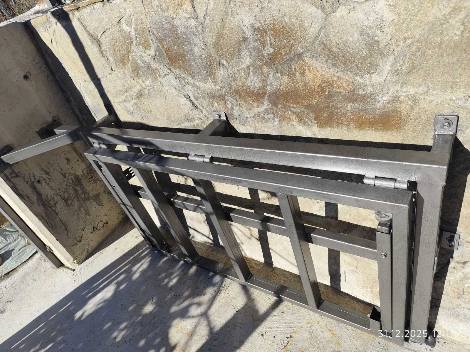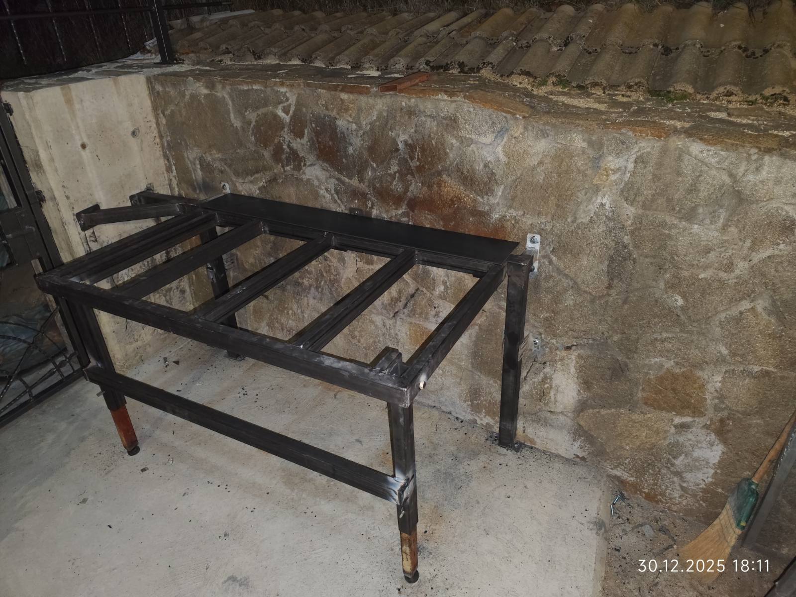 Качвам снимките на моята конструкция в нов пост, в горния не мога да вляза. Остава по следващата седмица да заваря ламарината, също и ограничители при сгъване да не отрежа някой пръст, че става гилотина в момента особено с тежеста на ламарината като я добавя, може и едни дръжки от двете страни на плота. Стената отзад е кухи бетонни блокчета налепени с камък и се наложи да монтирам шпилките с химически анкер.