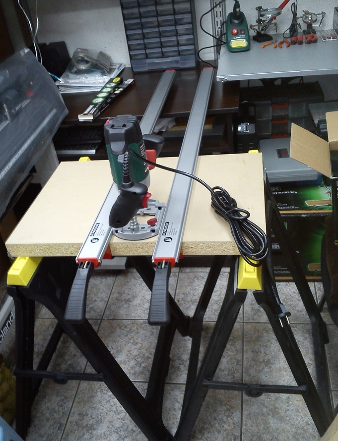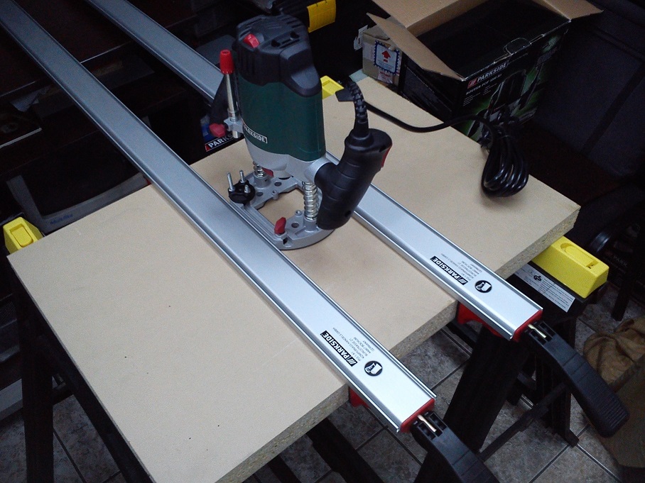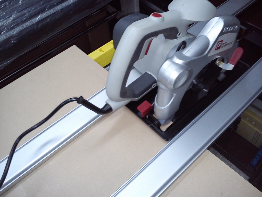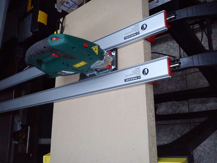За водач на циркуляр по добре да си направите водач от част от лист шперплат и да залепите шкурки отдолу. В повечето случаи даже няма да се налага да застопорявате шината а ако се наложи две щипки ще вършат идеална работа, а и така винаги ще виждате къде ще ви минава сряза. С шината всеки път трябва да се съобразявате къде ще се падне диска.