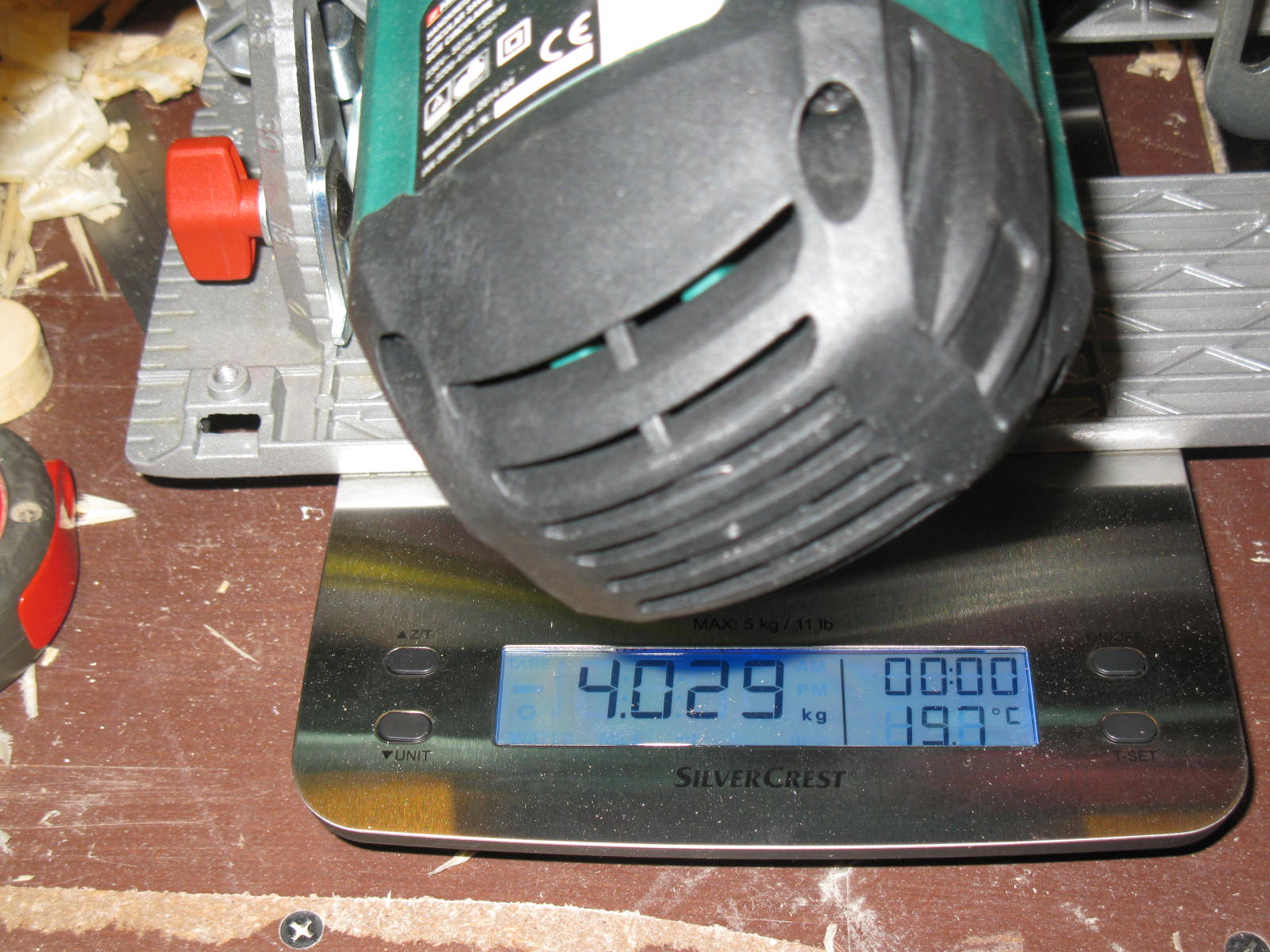 Тегло без кабела 4,026 с кабела около 4,200, за сравнение ще дам стария ми циркуляр който е 1100W и диск 165 който с кабела тежи 4,600