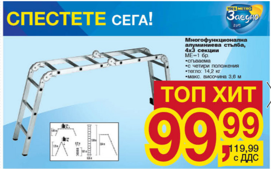 Ами аз виждам цена на РУБИ-то 281 лева, на Щила 242 лева. Доста по-скъпи от лидълската. За стълба, в четвъртък в метро пускат от тия чупещите на 120 лева и това е най-ниската цена, която съм виждал.