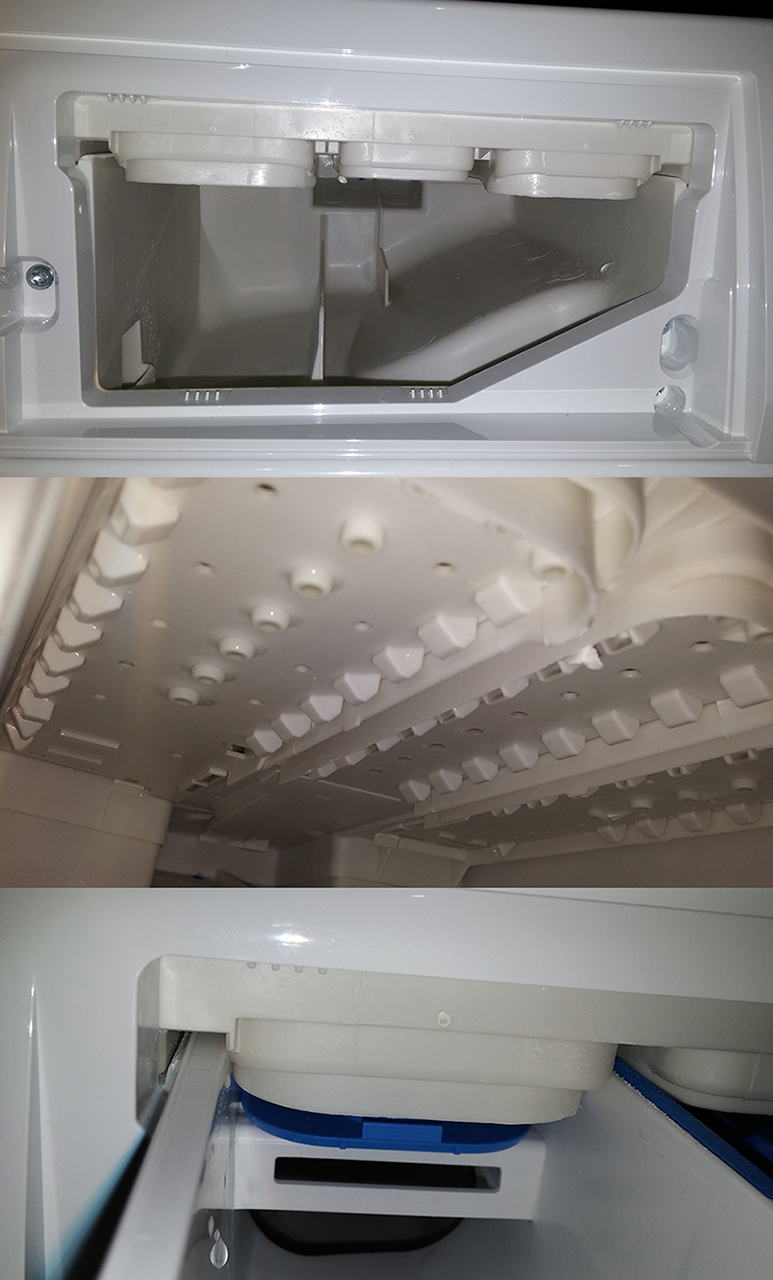 При плакнене редува ваничките,като в началото почва от предпрането(най-лявото),после в прането пуска вода за плакнене и накрая пуска в омекотителя(най-дясното).Там има само в средата дюзи и си пръскат нормално,без да прехвърлят стената на чекмеджето.Ето още малко снимки: