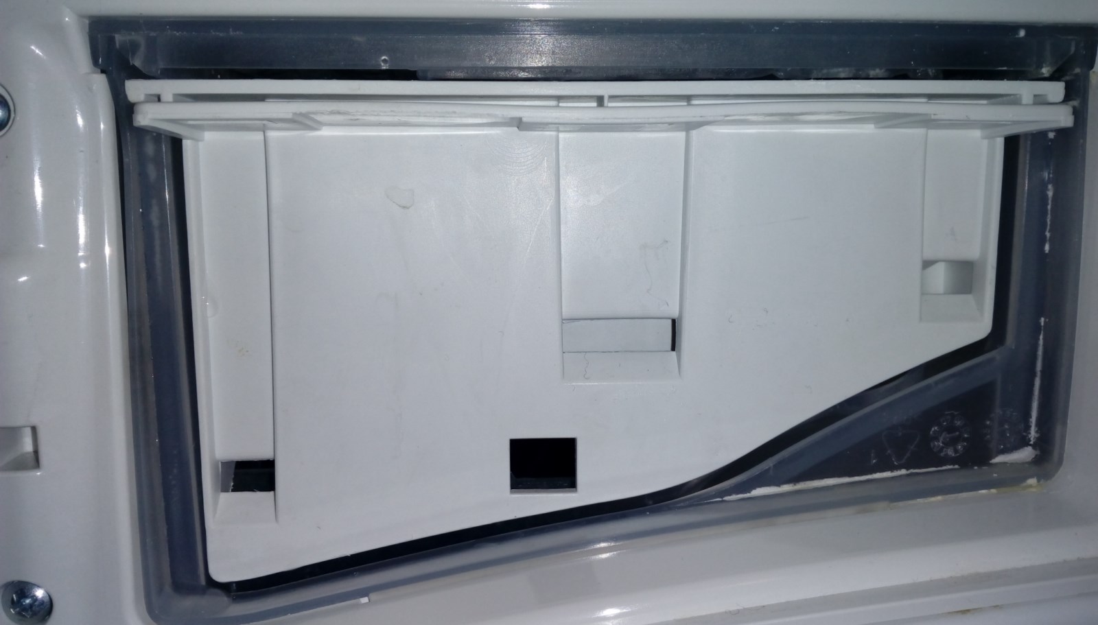 С кръгче съм отбелязал откъде водата подлизва,даже по периферията се виждат капките останала вода.За да разбера точно как се случва отворих чекмеджето наполовина и се вижда че крайния ред от пръскалките хвърлят водата по ръба на чекмеджето и част от нея се стича по страницата от външната страна и така подлизва.Прах не слагам в чекмеджето,а ползвам само капсули или течен препарат директно в барабана.На двете снимки тук се вижда задната страна на чекмеджето и прозрачния "таван" с пръскалките.