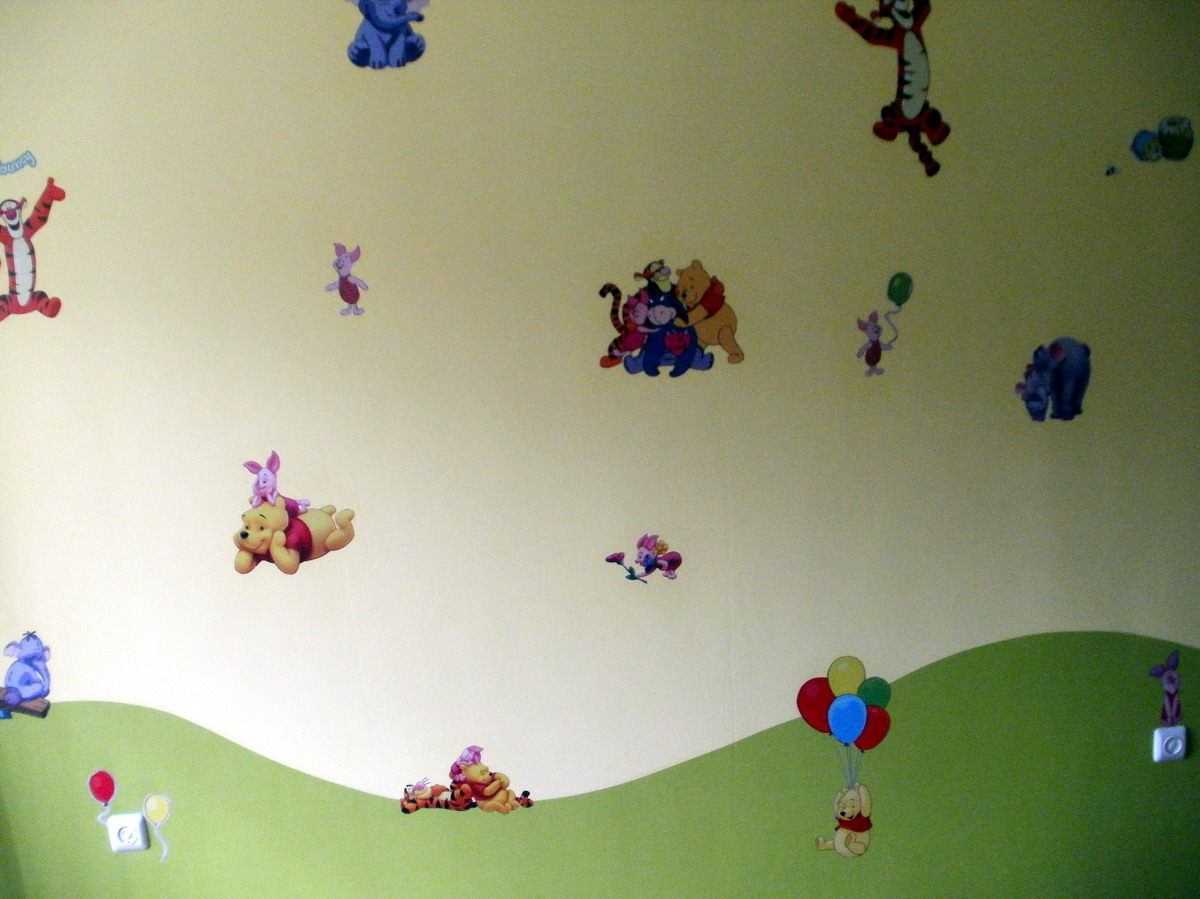 Здравей! Аз докато ти отговоря, може да си си намерил вече :? . Всъщност не са стикери, а хартиен тапет. С голямата картинка си поръчахме и 2м2 тапет с различни малки картинки на Мечо Пух. После падна едно голямо изрязване на картинките и накрая лепене с лепило за тапети. Успех