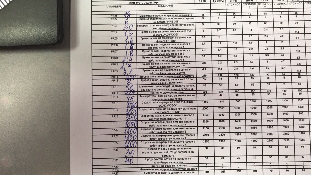 пон ное 25, 2019 10:54 pmAngelari написа: Как става например при зададена 60 Т на водата кат стигне 70 да гасне примерно ако има такава настройка ? Иначе контролера е подобна като на Алфа пламКолега,пробвай с параметри PR12 и PR23(прилагам параметри)Параметри за камината.jpg