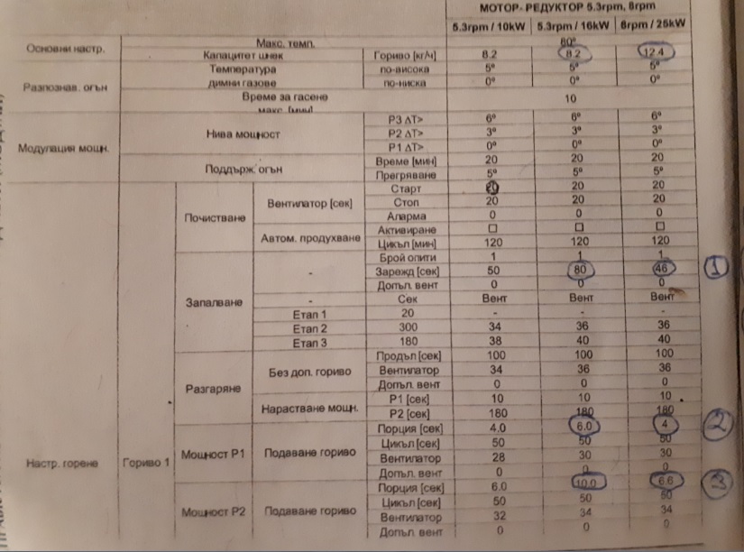Инсталатора ги завиши доста още преди да я запалим първия път, явно на други места като е настройвал така е било нужно. На мен с течение на наблюдението на горенето ги коригирах надолу, докато стигнах по-горе посочените. На Р1 7,5 сек. / 55 сек./ 28 вент. Р2 - всичко е както заводските. Р3 8,5 сек. / 30 сек. / 42 вент.