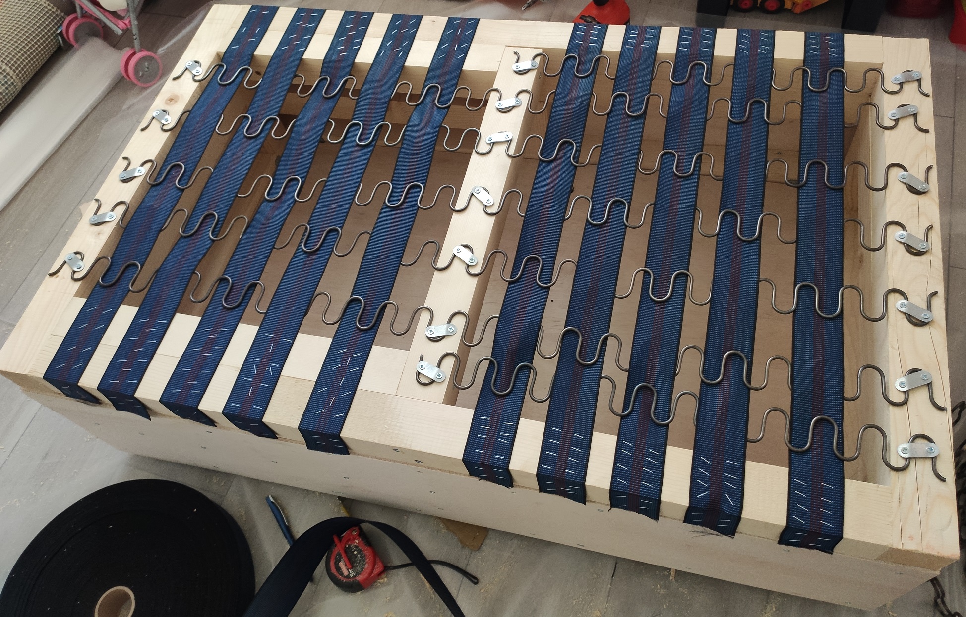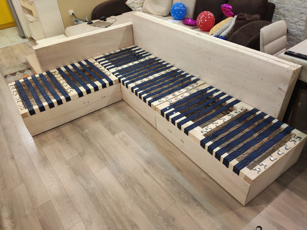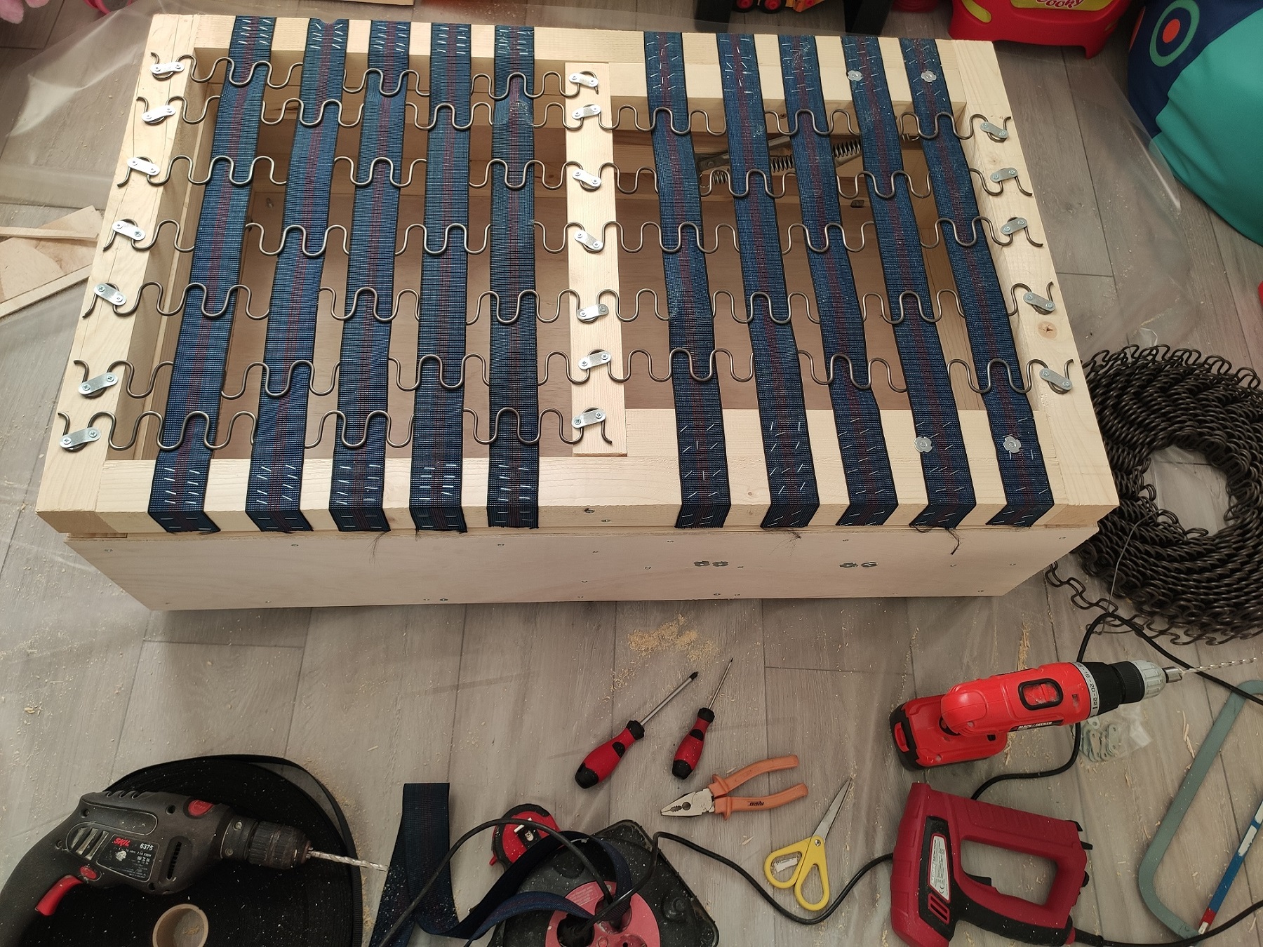 Първоначалната идея ми беше да сложа ластици под дунапрена, но все повече си мисля, че няма да се получи добре и ще потъва. Замислям се да сложа отгоре шперплат 9-12 мм, за да няма разлика в нивото на седянката...