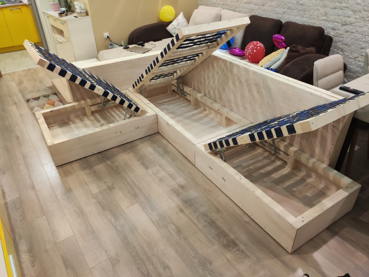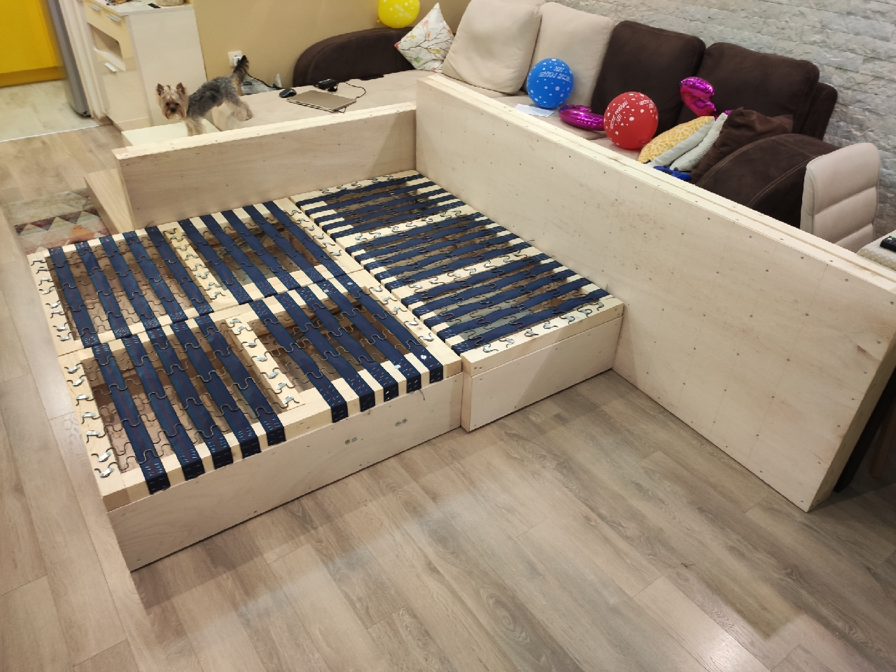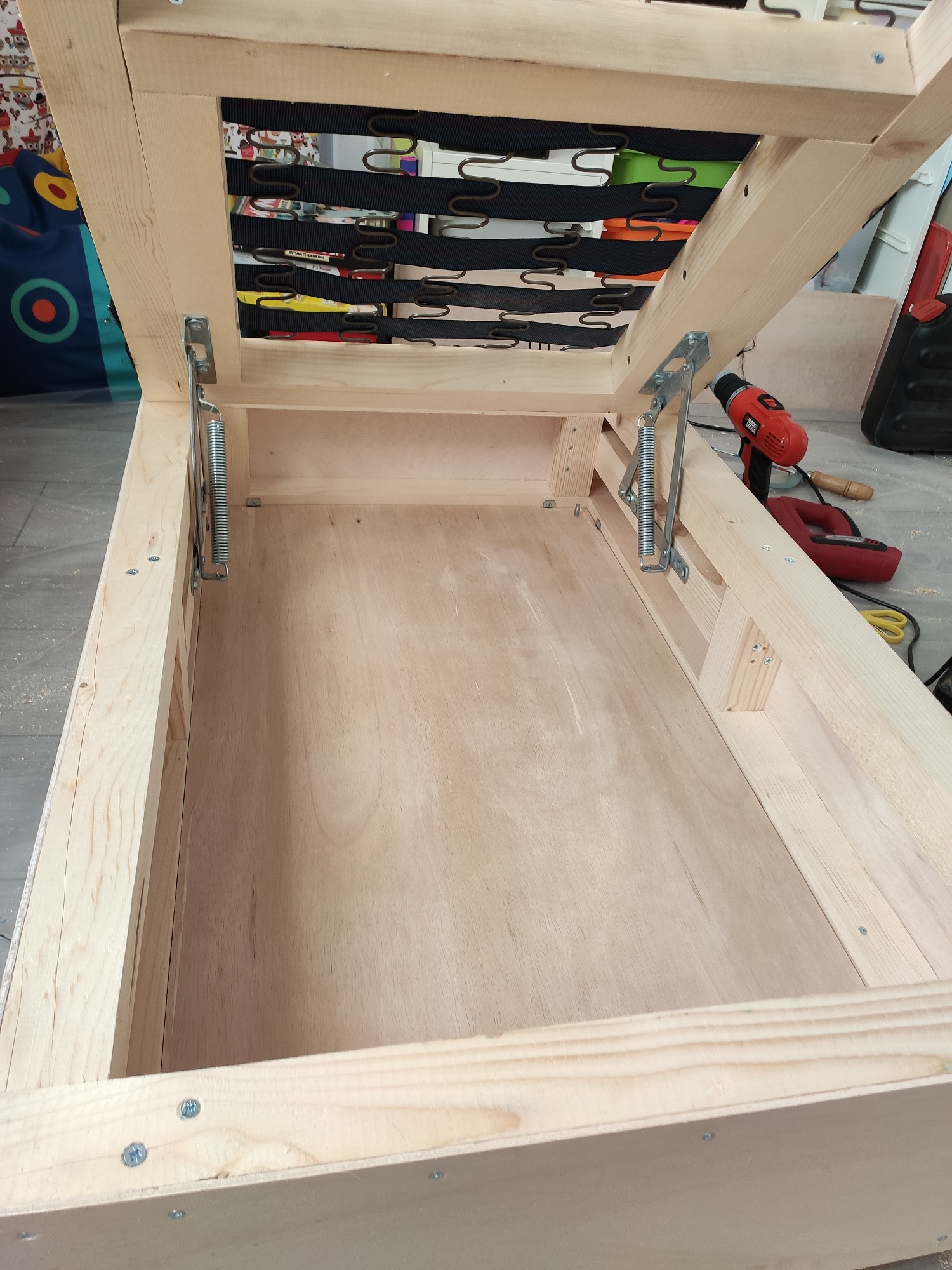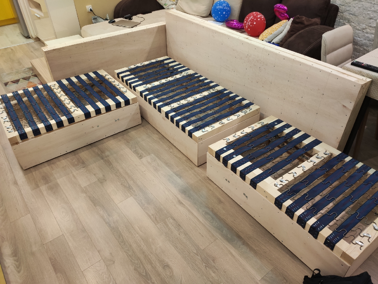 Първоначалната идея ми беше да сложа ластици под дунапрена, но все повече си мисля, че няма да се получи добре и ще потъва. Замислям се да сложа отгоре шперплат 9-12 мм, за да няма разлика в нивото на седянката...
