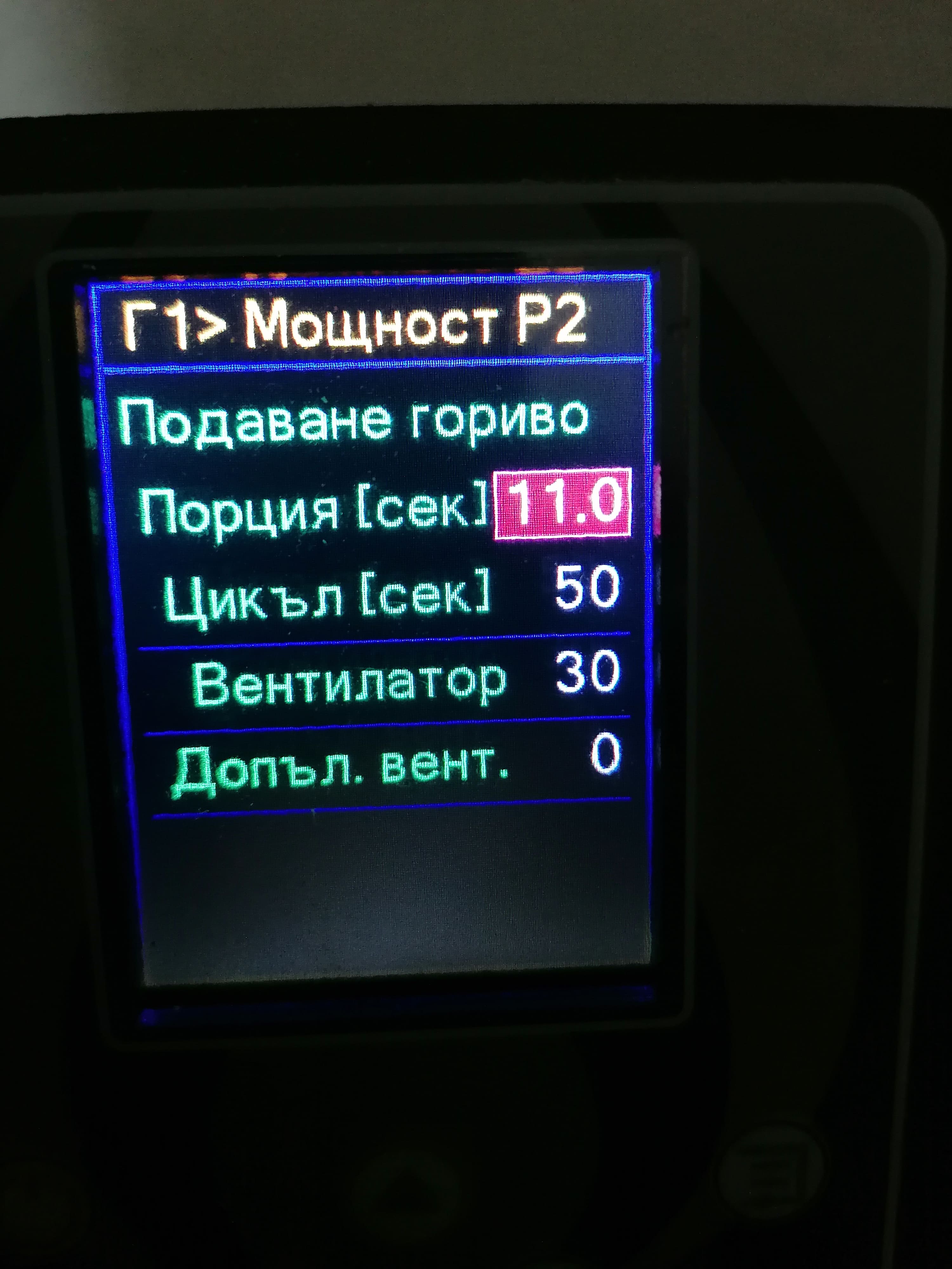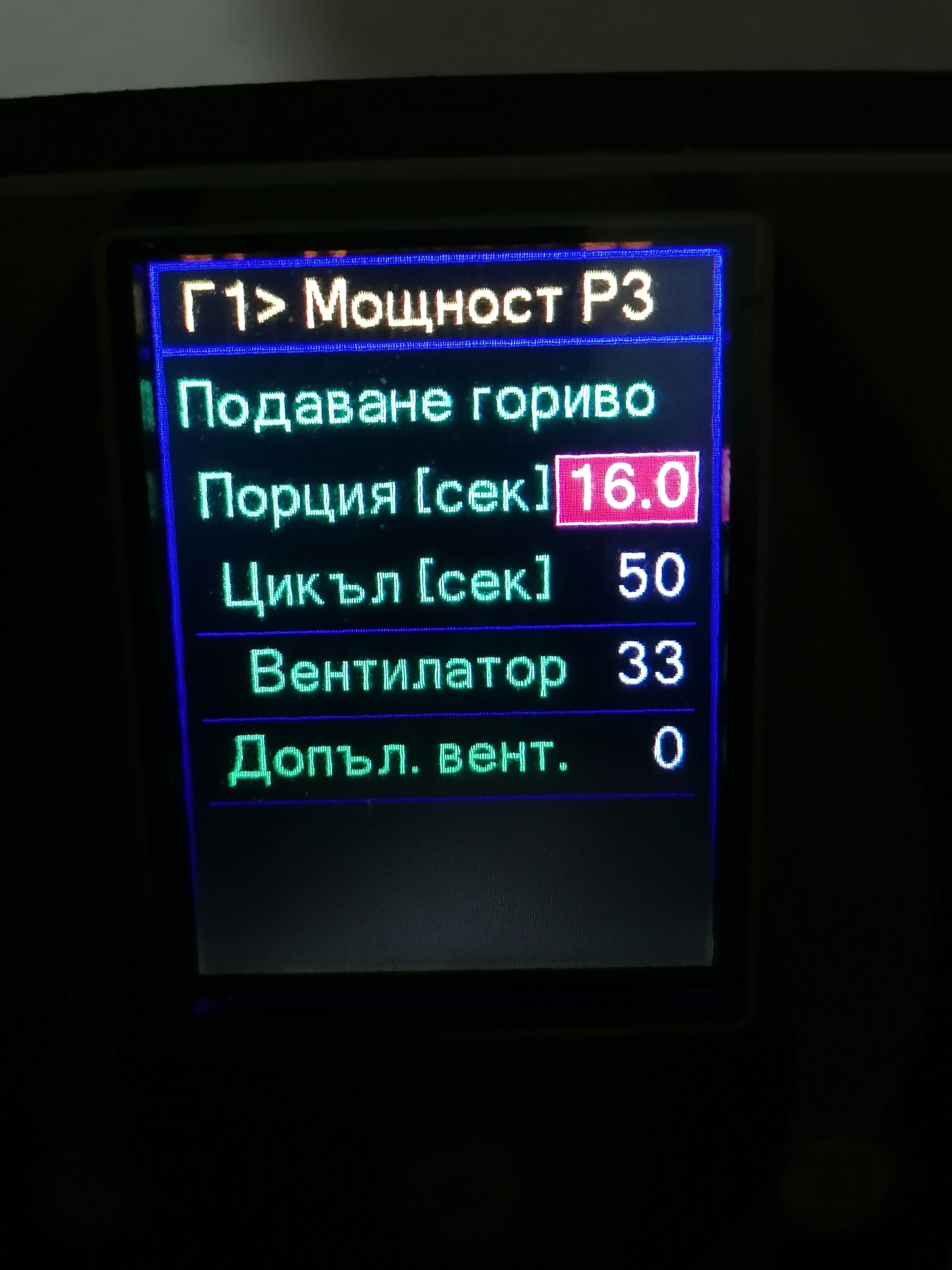 Здравейте от скоро съм с пелетна камина на Грейко Бижу дизайн, за сега си работи без проблем, настройките които ми направи инсталатора бяха д/г добре, но ги направи спрямо пелетите които продава той, а на мен не ми харесаха, че имаха много прах в чувалите и бяха много натрушени (къси на дължина), преди 2 дни купих 70-30 иглолистни-широколистни пелети. Със старите пелети влизаше в Р1, рядко но влизаше, а с новите изобщо не може да влезе в Р1, главно гори в Р2 и от време на време Р3. Апартамента е ~120кв.м., като отопляеми са 95 с 6 радиатора, тухлен апартамент без изолация, само с ПВЦ дограма, радиаторите са старички без термо глави понеже тръбите са стари и оставихме системата отворена и ми препоръчаха да не слагам за момента термо главите (купени са нови радиатори, тръби и термо глави, но е проект за на лято когато е топло) Качвам снимки на главното меню и настройките които ми направиха. Да вметна, че съм говорил с човека, но ще може да дойде след седмица и половина, а тогава не се знае дали изобщо ще се пали и дали ще ползвам същите пелети. Огъня е малко нисък - не стига до отворите над него и след 2-3 цикъла на зареждане почти угасва, но успява да се разпали след няколко секунди. Нормално ли е да не влиза в по-ниска степен заради радиаторите и липса на някакъв вид контрол на градусите освен на водната риза ? Температурата на водната риза е настроена на 65, водната помпа е настроена да се включва на 59 с хистерзиз 1. В апартамента е топло, не ни е студено, даже понякога става прекалено топло.