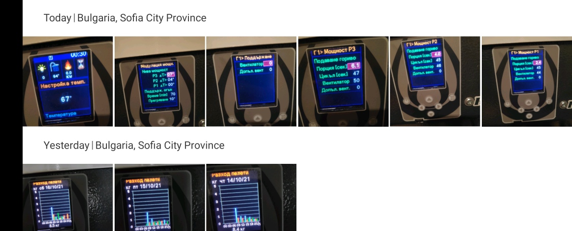 пон окт 18, 2021 10:08 amspeka_rs написа:Комина е вътрешен, зидан, двуетажна къща, провериха го при монтажа и казаха че е чист. Мощностите които ми визуализира са: Р3: 13.7Kw, Р2: 9.4Kw, Р1: 5.6Kw. Шнека не съм го мерил, може би довечера като я загася, иначе виждам в настройките зададанo "Капацитет шнек" [кг/ч]: 21.2 - предполагам хората, които ми я монтираха са го въвели.пон окт 18, 2021 12:27 amjaspet написа: Здравейте, имам пелетен котел грейко 20 и горелка 20 стар. С тях ще отоплявам къща около 120 кв на 2 етажа и сутерен, който е около 50 кв където е котела, но в момента се получава така че само първия етаж ни е готов, втория по натам и съответно котела идва голям за тази площ. Реално се ползват само 4 радиатора, бойлер 150 л. и една лира за около 55 кв площ на първия етаж, сутерена си се затопля само от котела. Къщата е изолирана и с пвц дограма. Ползвам стаен термостат. Проблема е ,че горелката много често влиза в съспенд, след всяко включване от термостата. Трябва ли да променям някакви настройки, докато почнем да ползваме цялата къща. Иначе разхода от последните хладни дни (7-8 гр) май не е лош. Харчи по около 9-10кг на ден иглолистни. В къщи 23 гр през деня 20 през нощта. Високите квартали на София. Изобщо как да го оптимизирам за временно по малката площ тази зима? Прилагам настройките в момента:Оптимизирането е само буфер.
