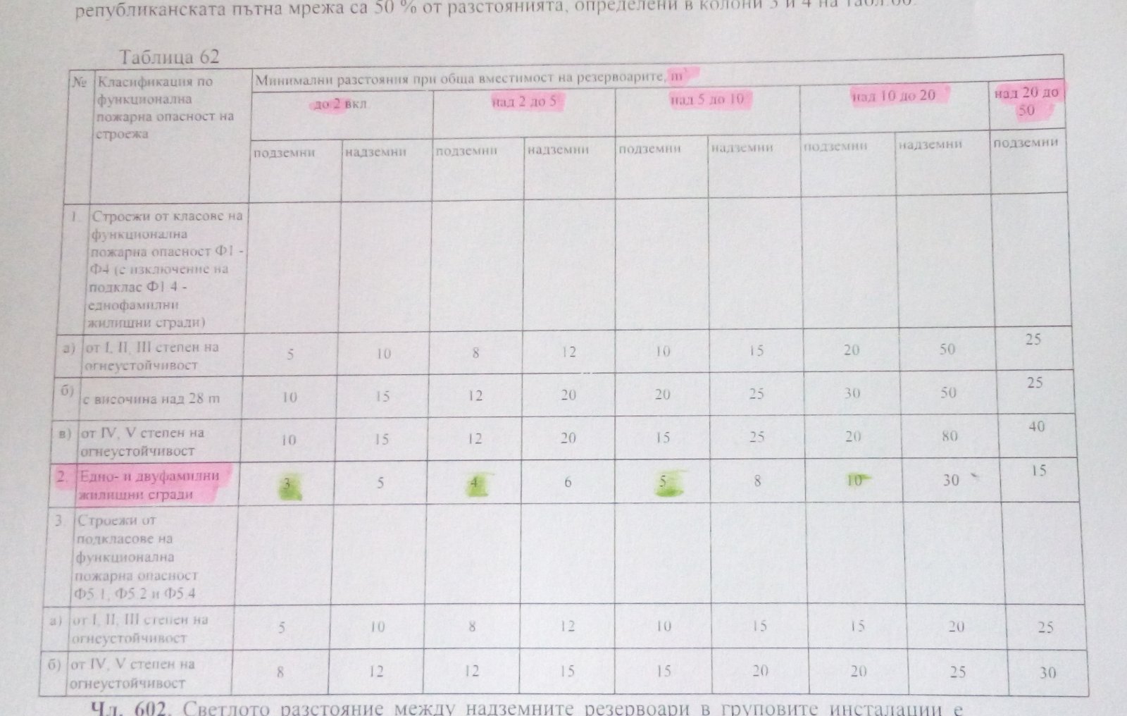 До 5м3 цистерна вкопана - 4м отстояние, надземна 8м отстояние. До 1м3 се води бутилка и не е необходимо отстояние. Четири метра могат да се осигурят почти във всеки двор