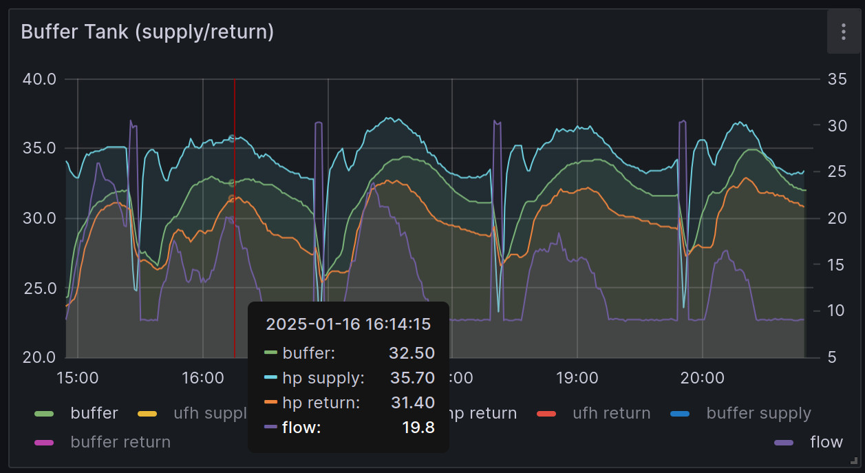 Под 30° връщащата не пада.Единствено малко преди да включи ТП,когато буфера е паднал на 30° температурите се изравняват 30° на 30°. Ако ТП не се включи,продължават да падат,но пак са еднакви.
