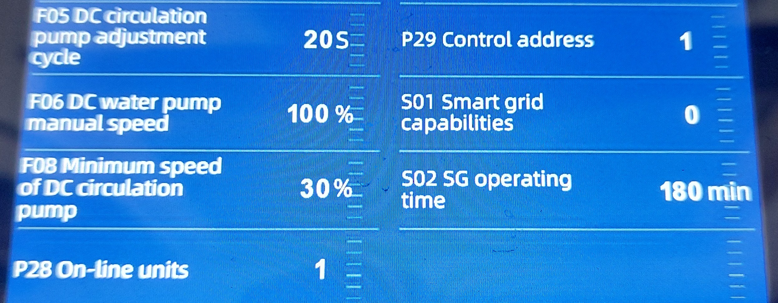 Пробвай следното - F02 на 1 (за да не спира помпата като достигне зададената температура) и F08 (Minimum speed of DC circulation pump) на 10% и P02 си го върни на 5 градуса.