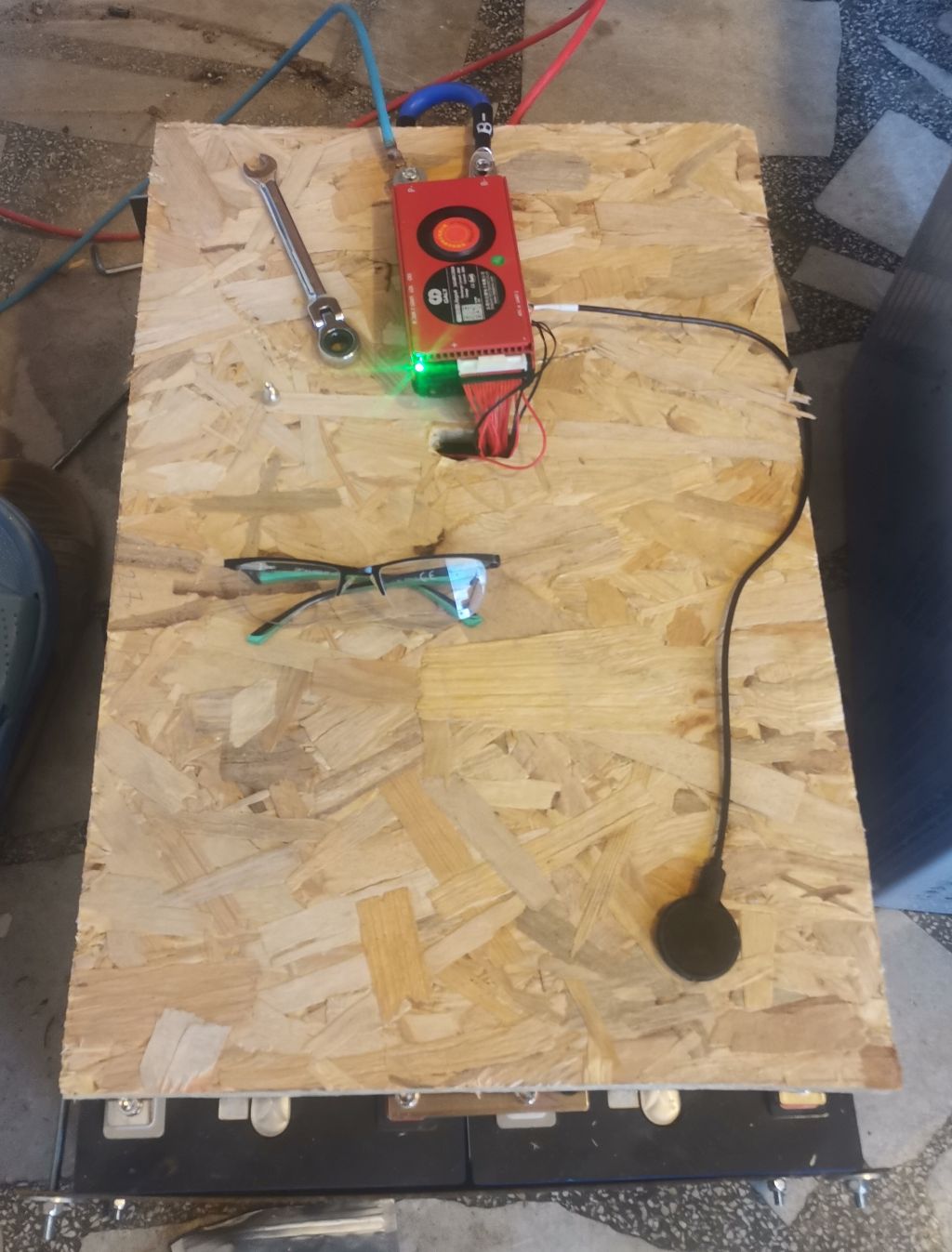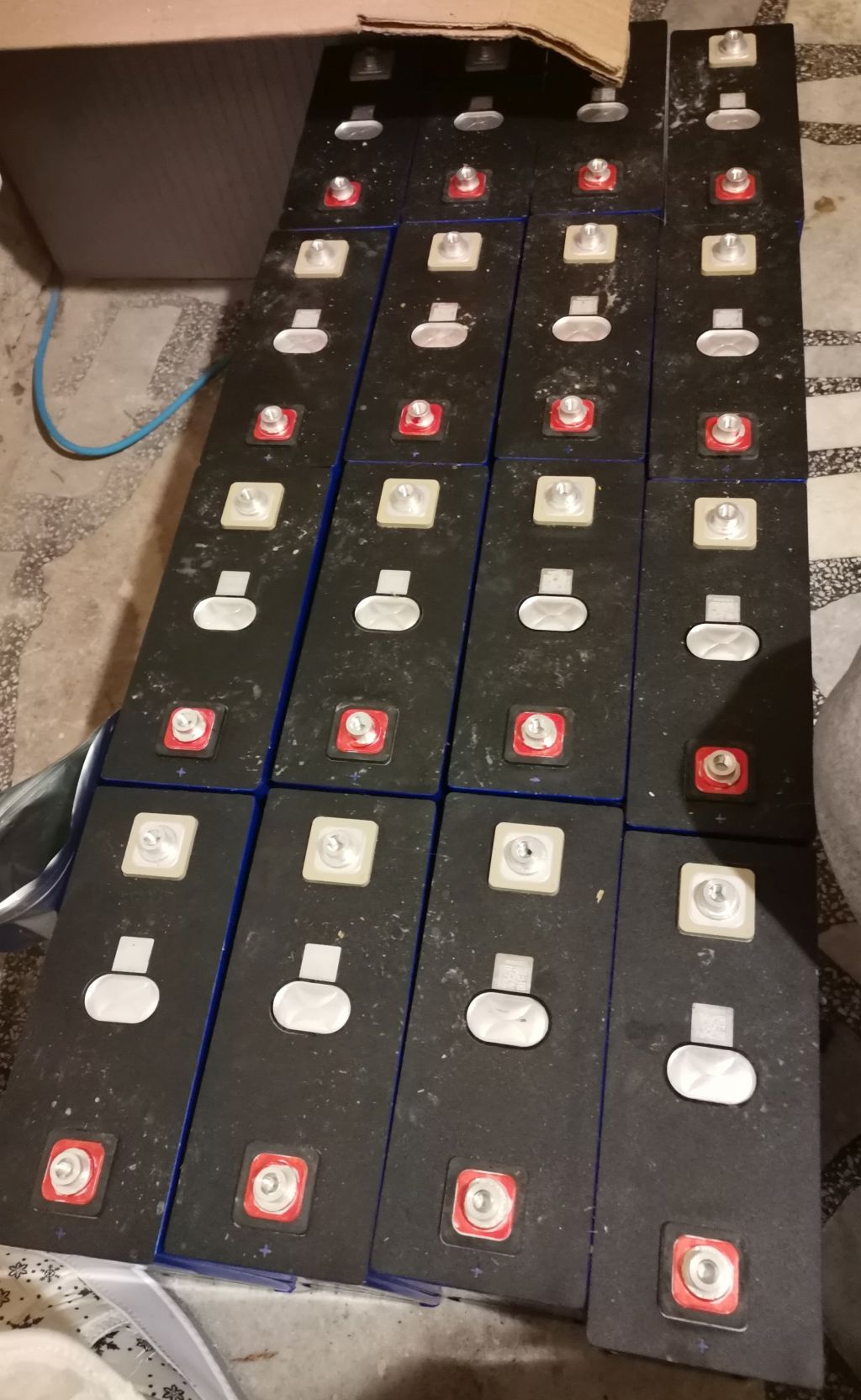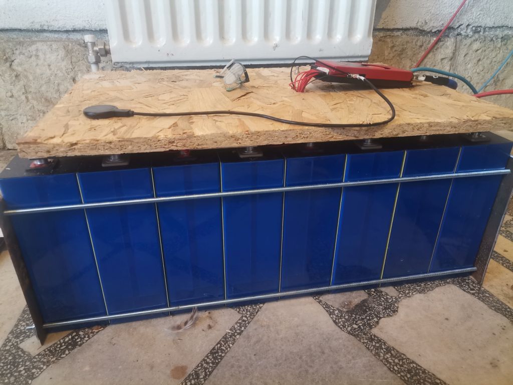 Първоначално беше със стари оловни акумулатгори 100Ah, в началото на месеца пуснах и новата батерия-самоделка с 16 броя Lifepo4 елемента по 288Ah и BMS контролер, който да ги управлява.