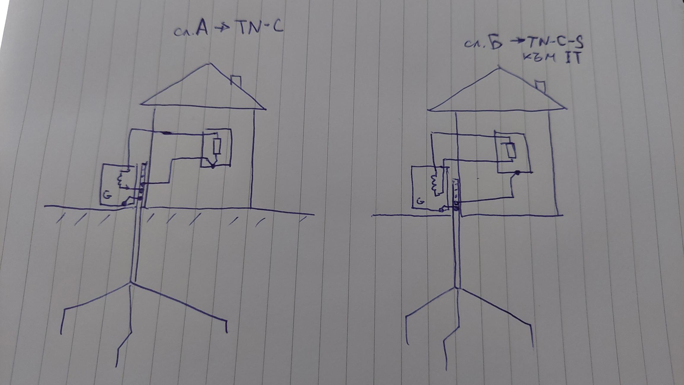Това са вариантите на топология на свързване при двете TN-системи при заземена къща. Първоначално приемаме заземителя за идеален. Умишлено не давам PEN-проводника на Енергото! За него трябват много размишления и обсъждане. ВНИМАНИЕ - разединяването от заземител на PEN-проводника, идващ от Енергото е много, много опасна работа и може да се получи даже смъртоносна!!!!!!