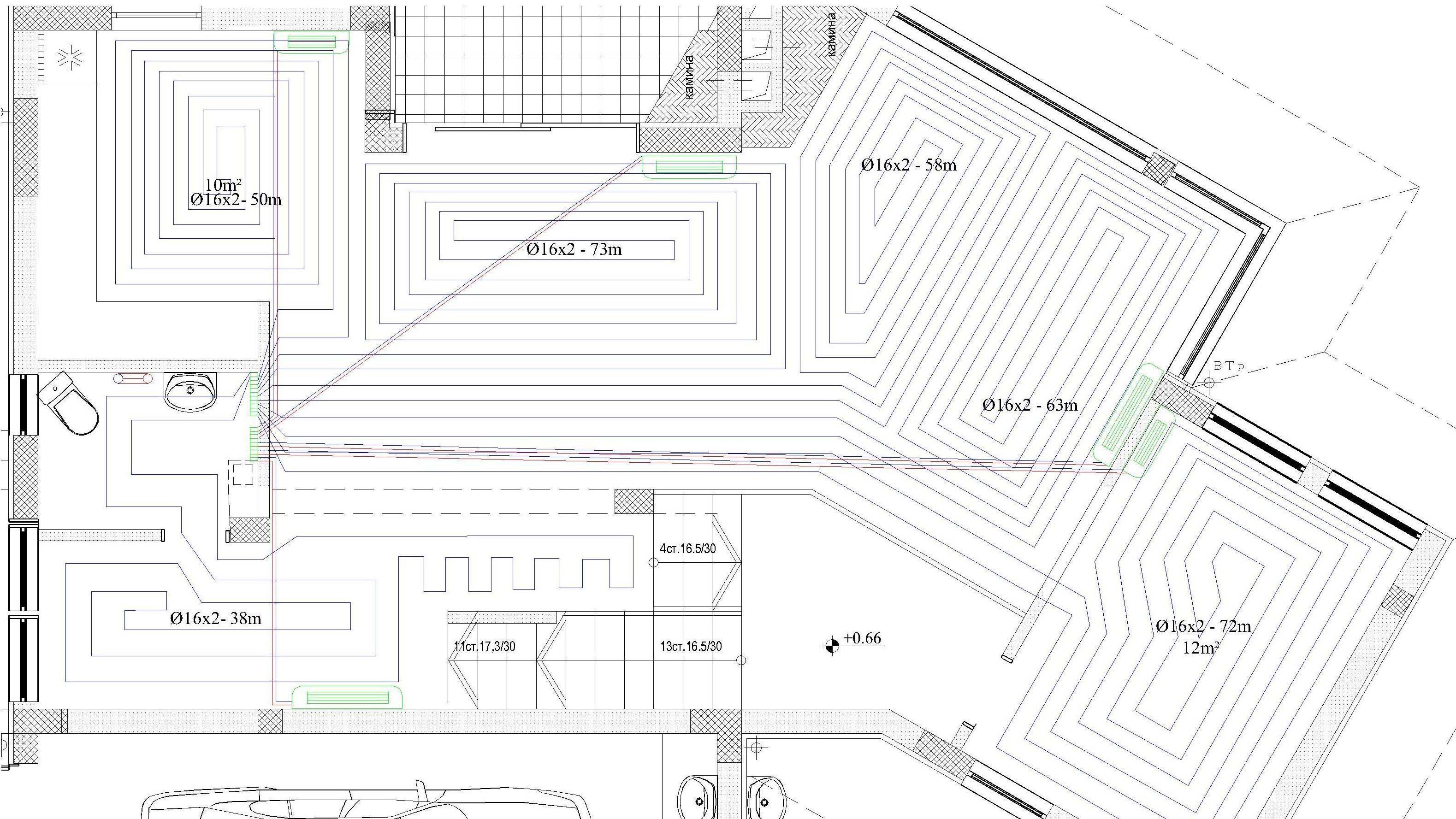Ето тва е новата схема с отделни колекторни кутии - за подовото и за конвекторите, сметнати са и дължините на всяка српентина(разбрах как се смятат, но така и не успях да заобля правите ъгли)