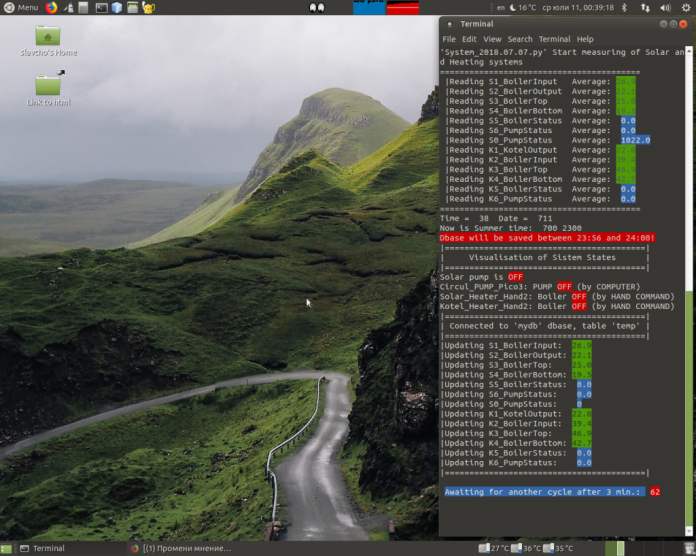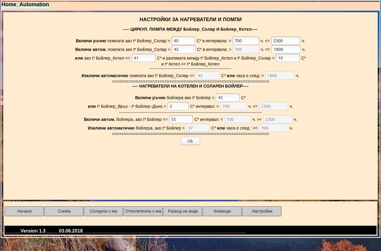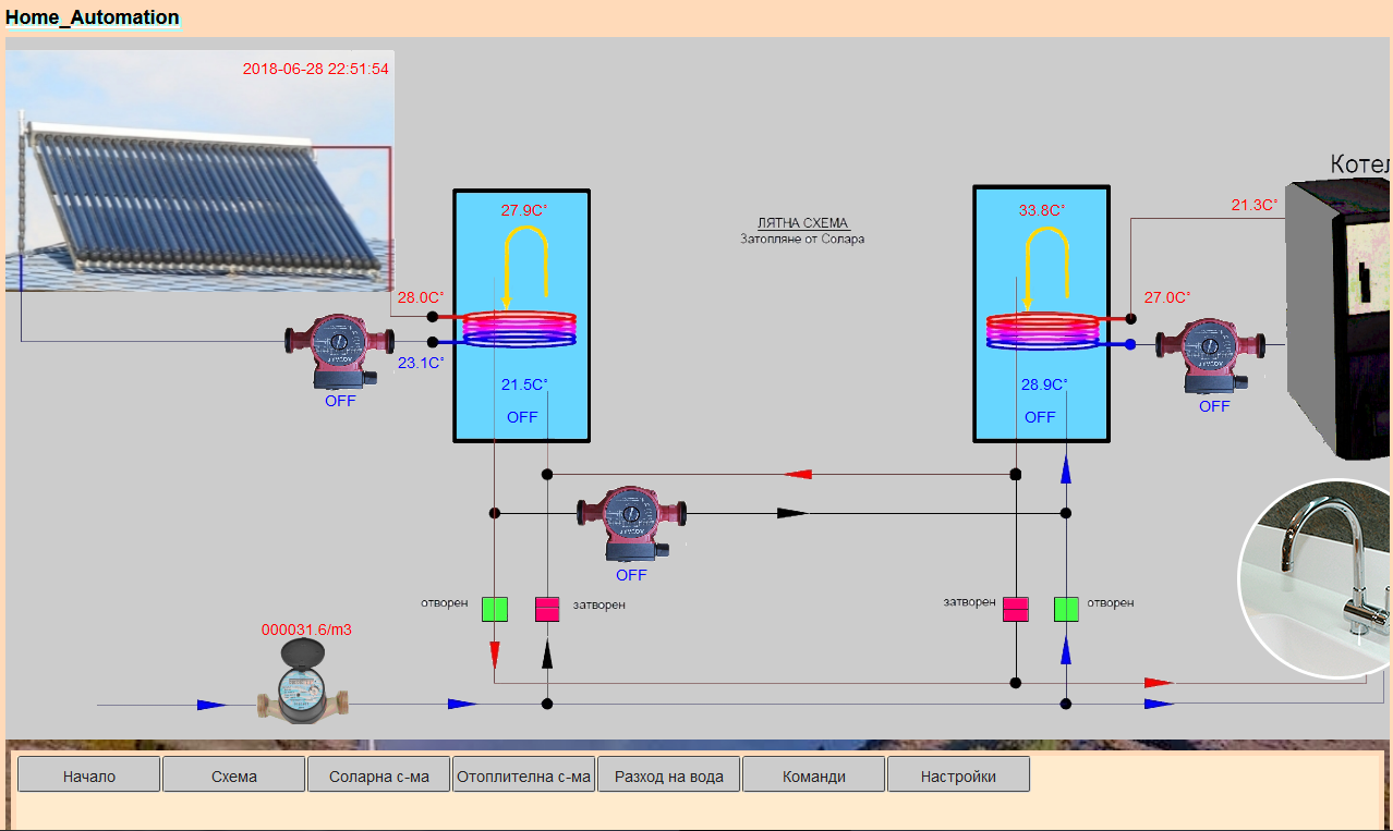 Системата работи под Linux и служи за контрол и мониторинг на поливна система, солар за затопляне на вода, котел, управление на помпи и нагреватели за два бойлера, с възможност за съхранение на всички отчетени данни и състояния.