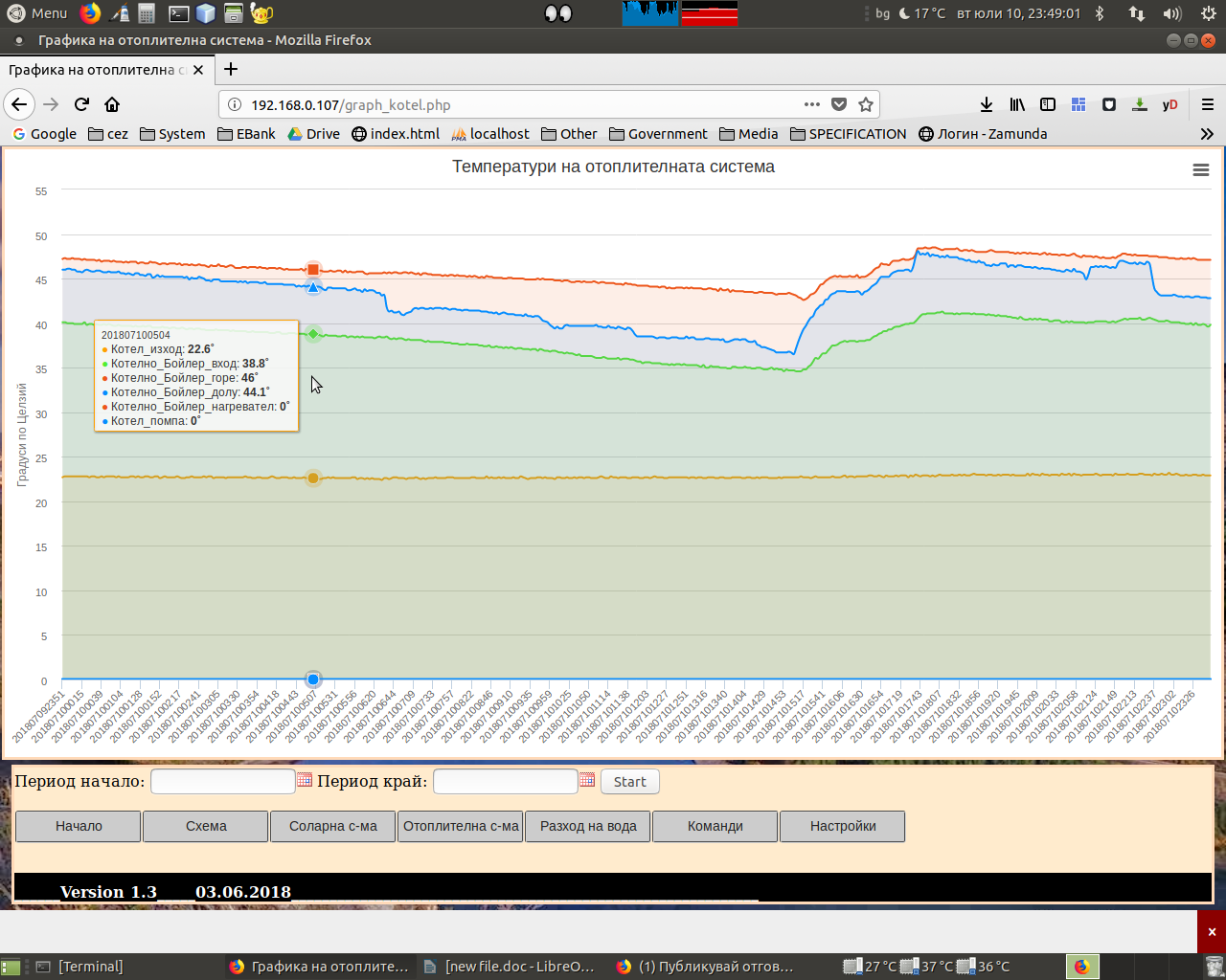Ето още снимки на екрана за настройки на системата и графиката за отоплителната система, както и екрана на локалния линукс сървър: