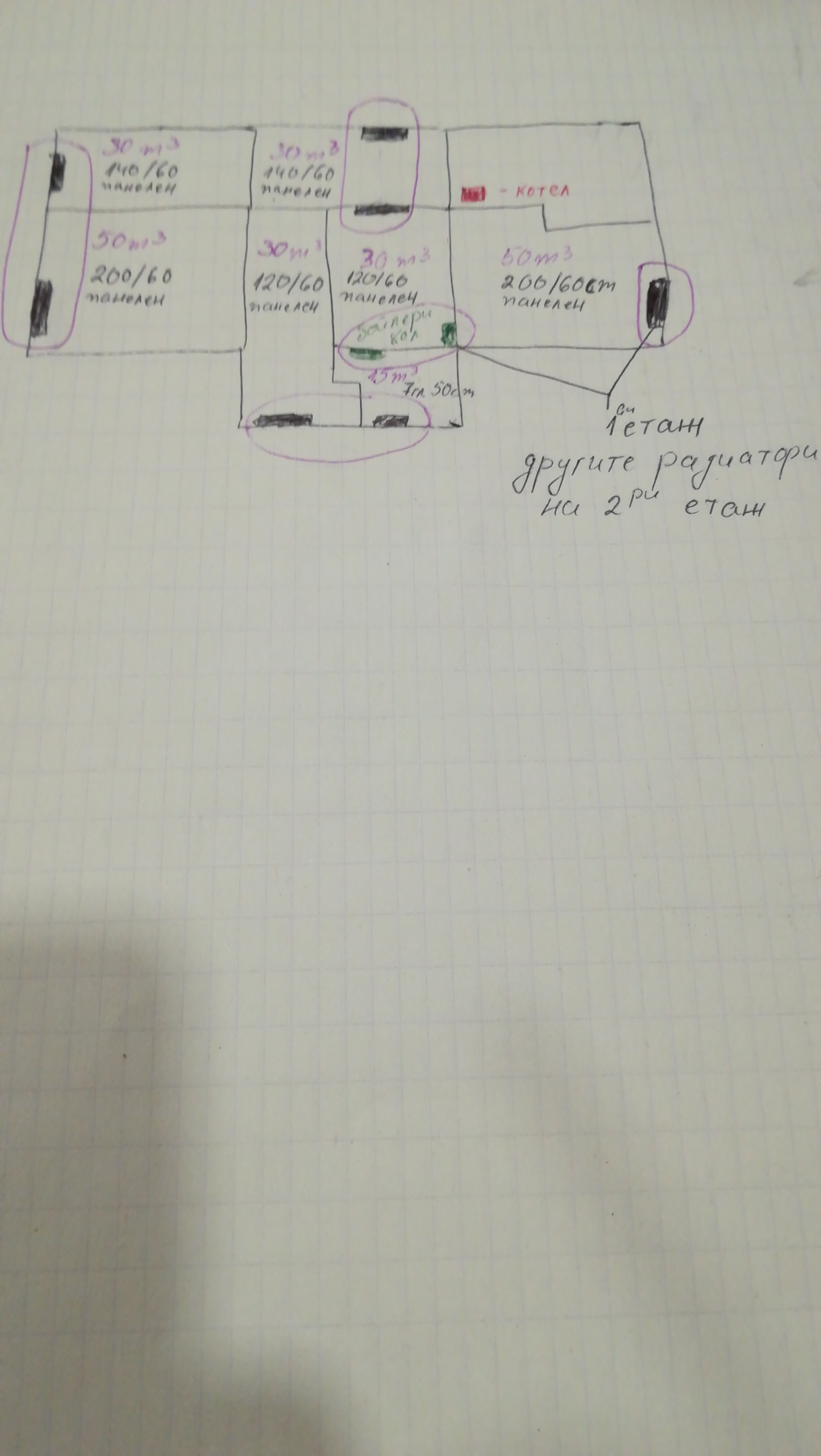 ?Общата кубатура е около 230 куб. м тази година ще е без изолация, сменена дограма и изолация на таваните и пода на втория етаж. Радиаторите са свързани по двойки, както съм отбелязал,захранени са ppr ф25 до тройника и към радиаторите ф20. Самостоятелния радиатор е с ф20, двата бойлера по 80л са отбелязани в зелено и са на един кръг.