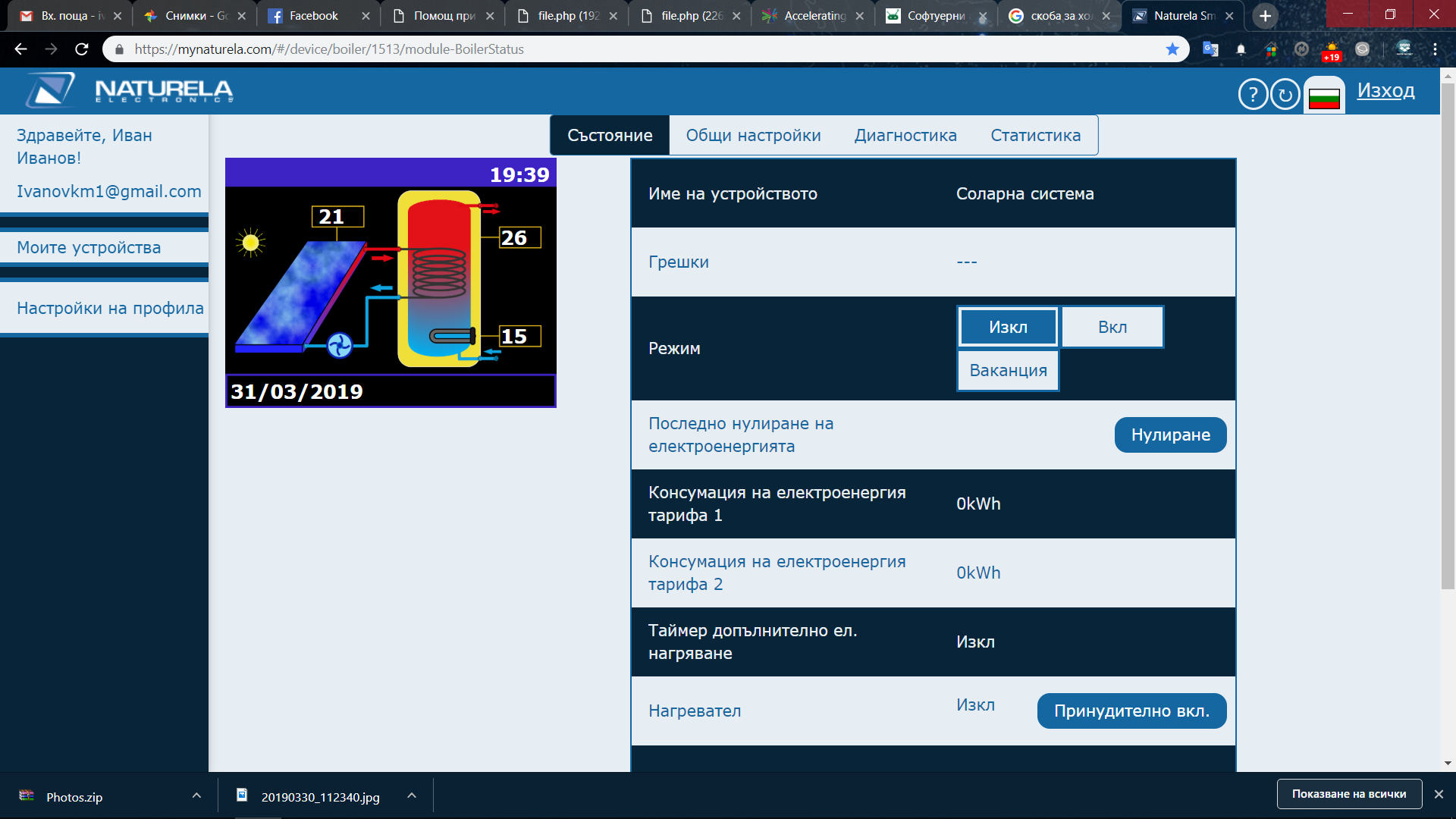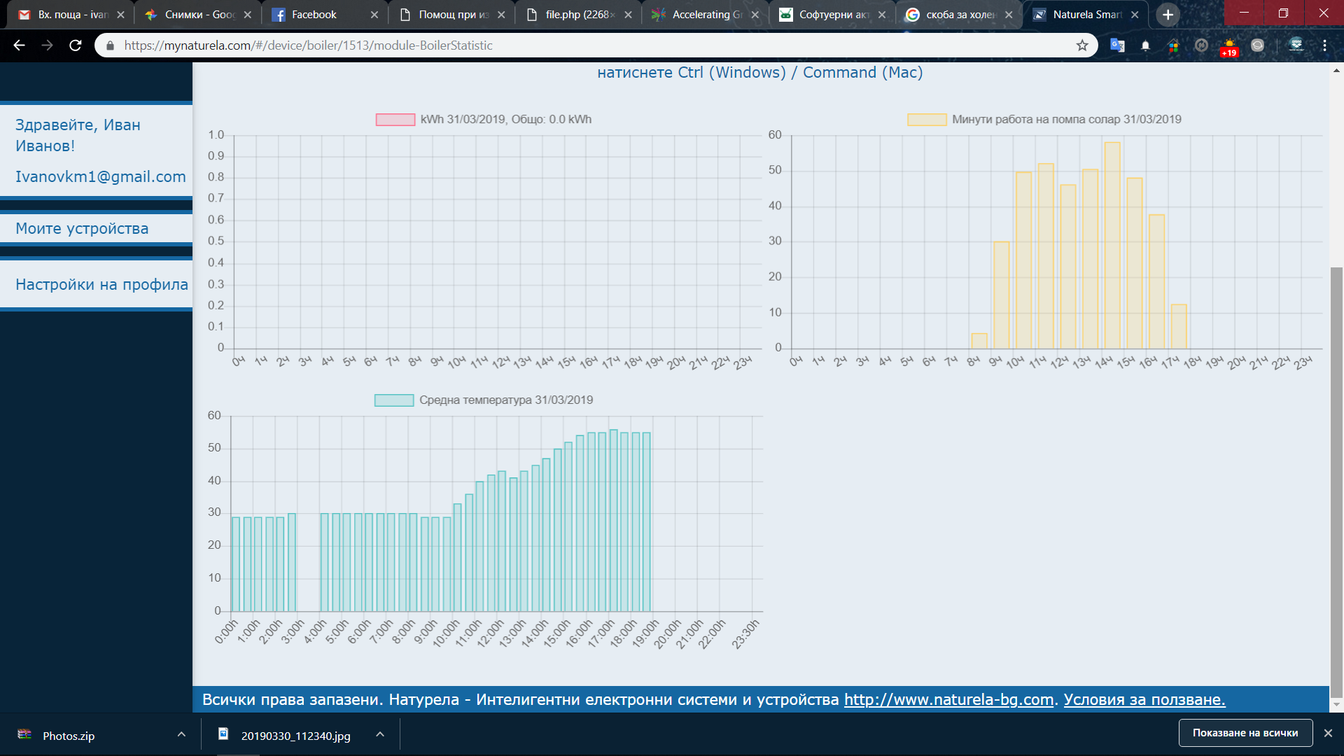 Няма как да знам защото тогава още не бях инсталирал Wifi-то. На мен сензора, който следи делта Т се намира с една идея по-ниско от входа на серпентианта, а др. сензор на бойлера е на входа на студената вода от водопровода. Този сензор се занимава с работата на нагревателя. Управлението ми е на натурела. Накрая на цикъла долу нй-ниско в бойлера става 53 градуса, в средата 56 градуса, а горе ако имам вяра фабричният монтирам термометър със стрелка е 60 градуса. Това са данни от днес като през деня е имало потребление на топла вода. Ето диаграма на работата на помпата и на това как се движела температурата в бойлера по средата.