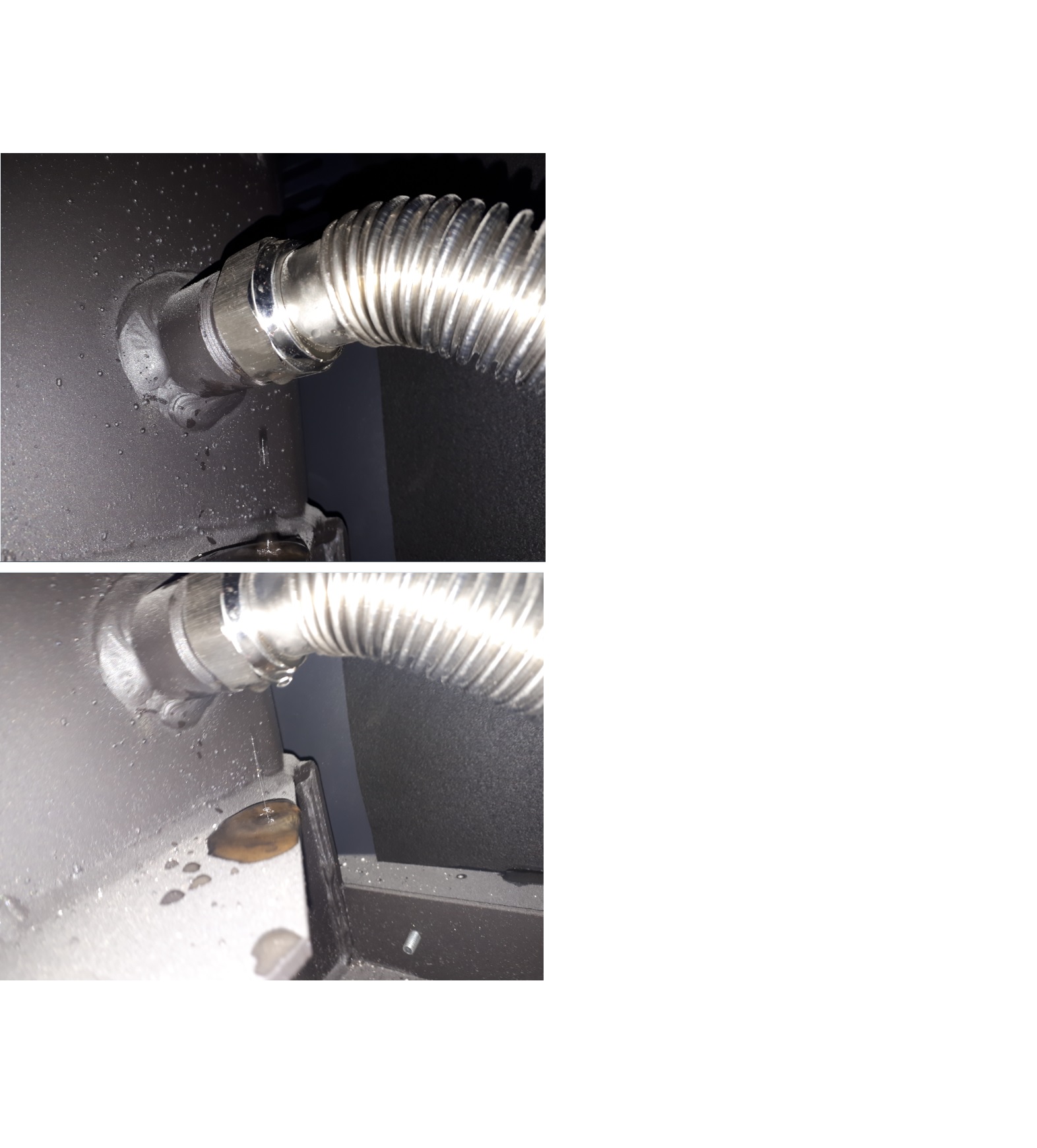 1. Според това което видях, камината е протекла защото връзката на съединението между помпата и водната риза (в горния край, от страната на ризата) е пренатегната и е скъсано уплътнението, което за мое голямо учудване беше гумено.